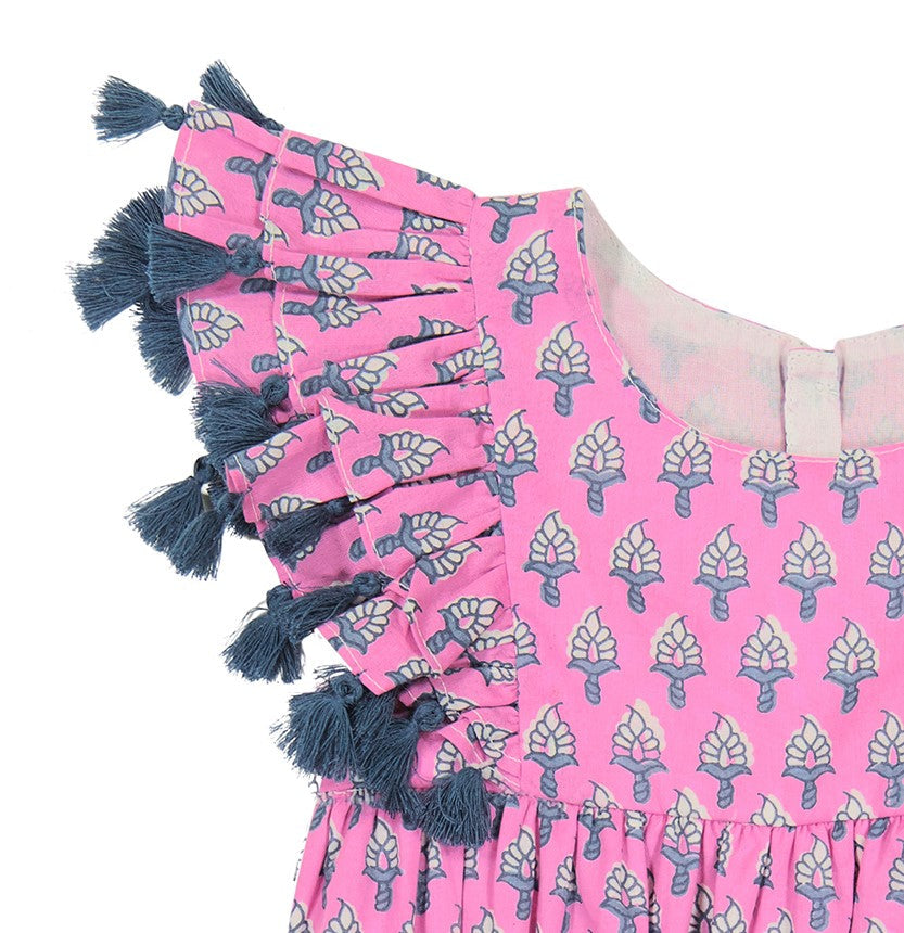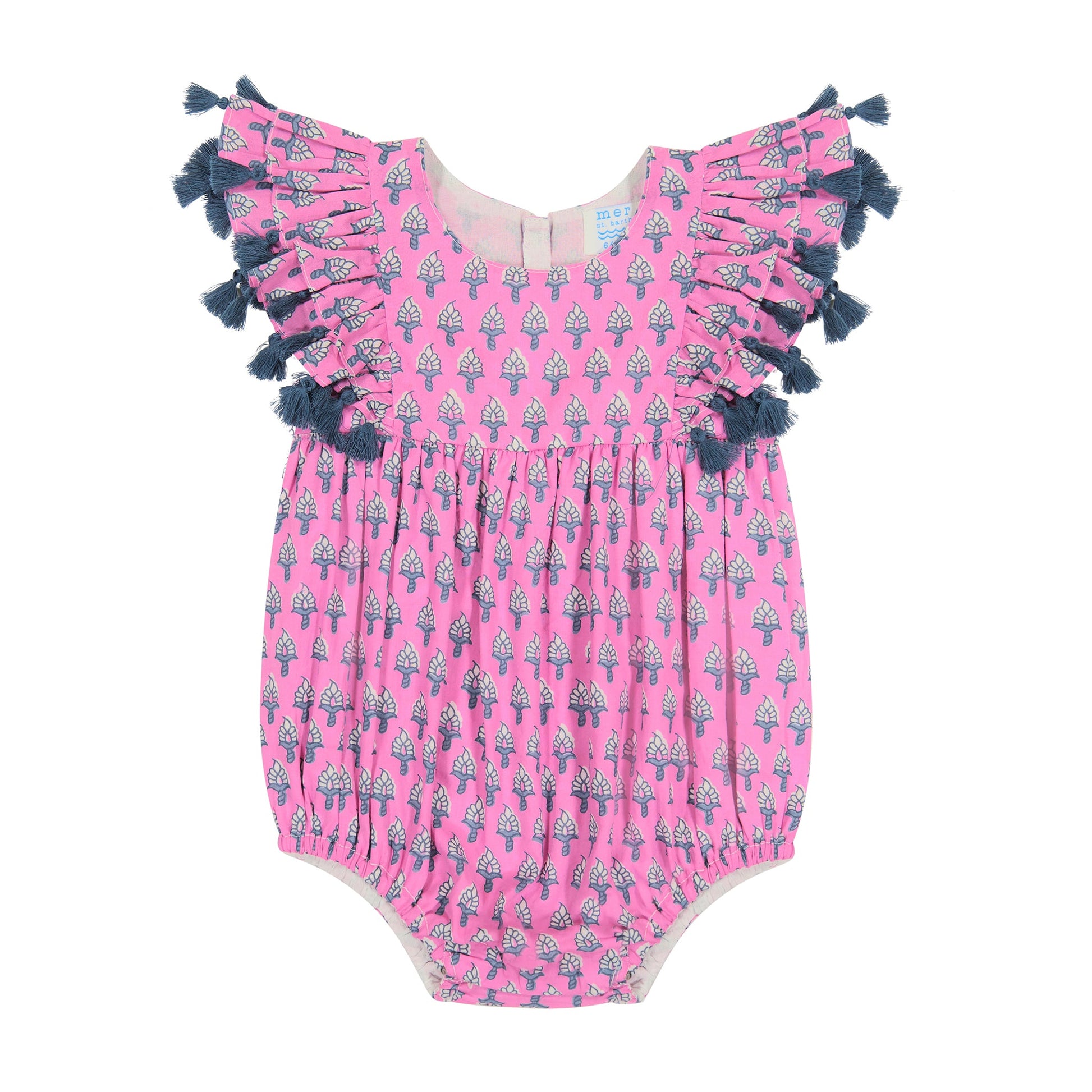 Flutter sleeve romper in a sweet pink floral with tassel detailing, and snap bottom closure. 100% cotton.