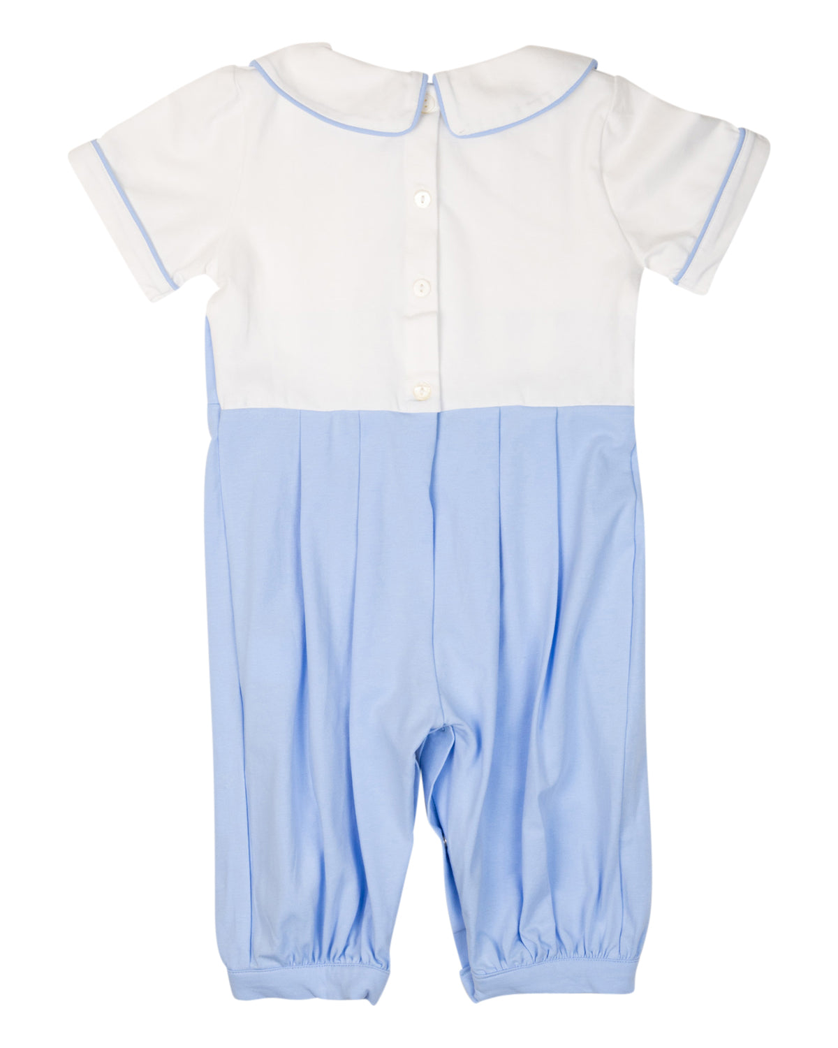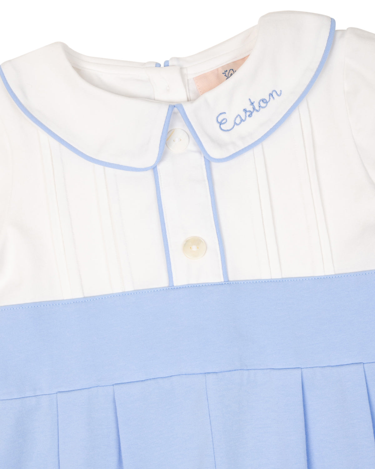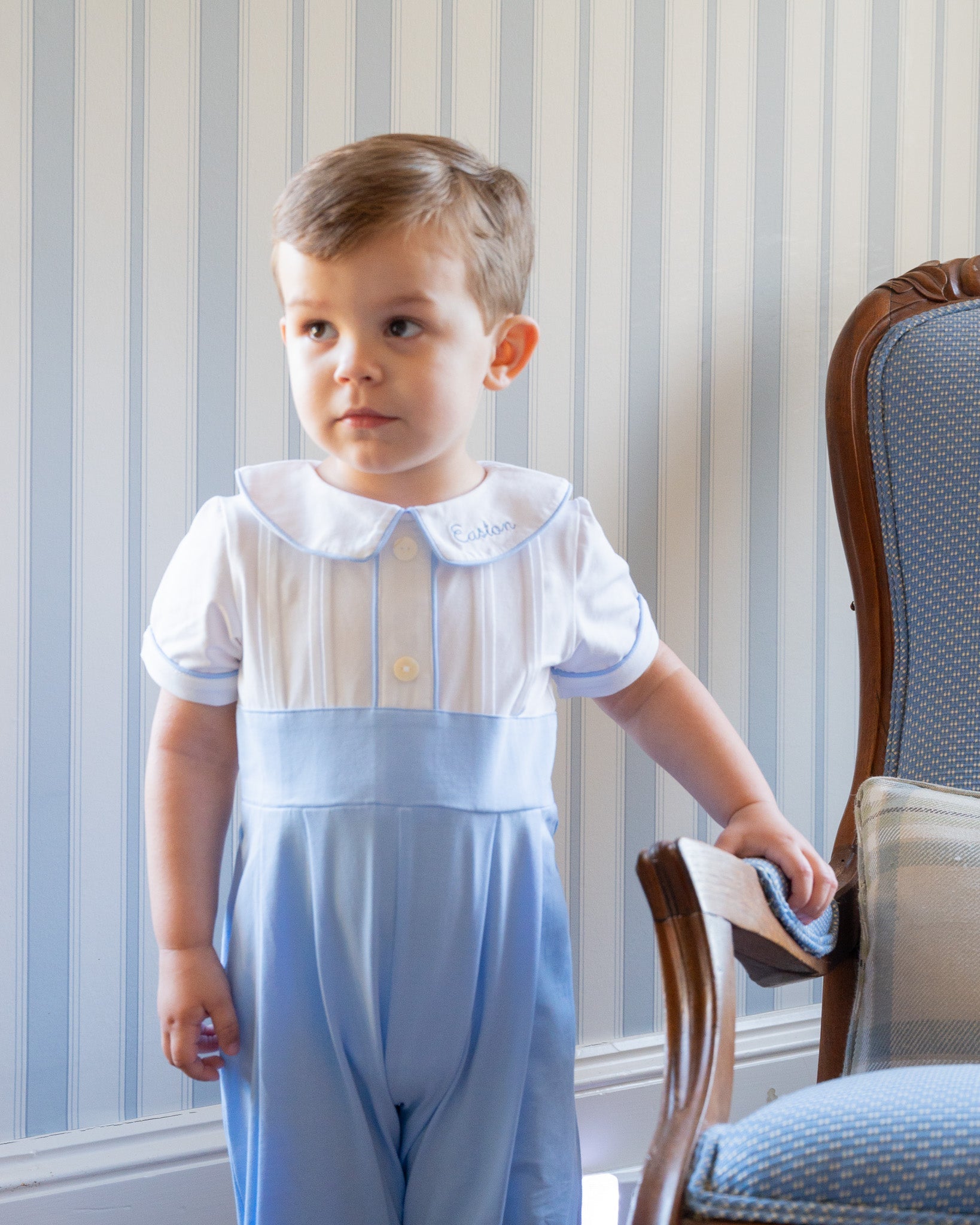 Such a classic look for Eater and spring. This Blue Knit Parker Longall with Short Sleeves features two buttons center chest, short sleeves and snaps in the stride for easy changing. Add a name to the collar for a personal touch.