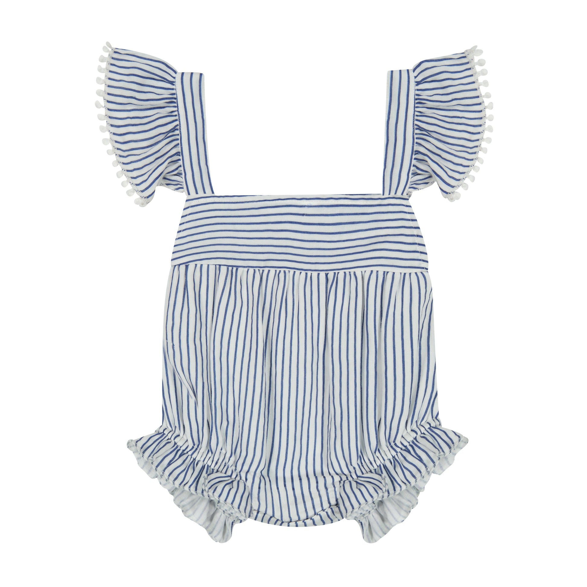 A sweet and delicate ruffled sleeve romper with adjustable straps and snap bottom closure.