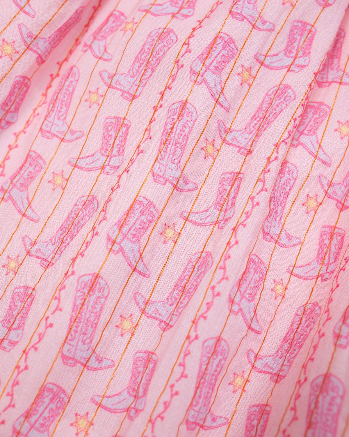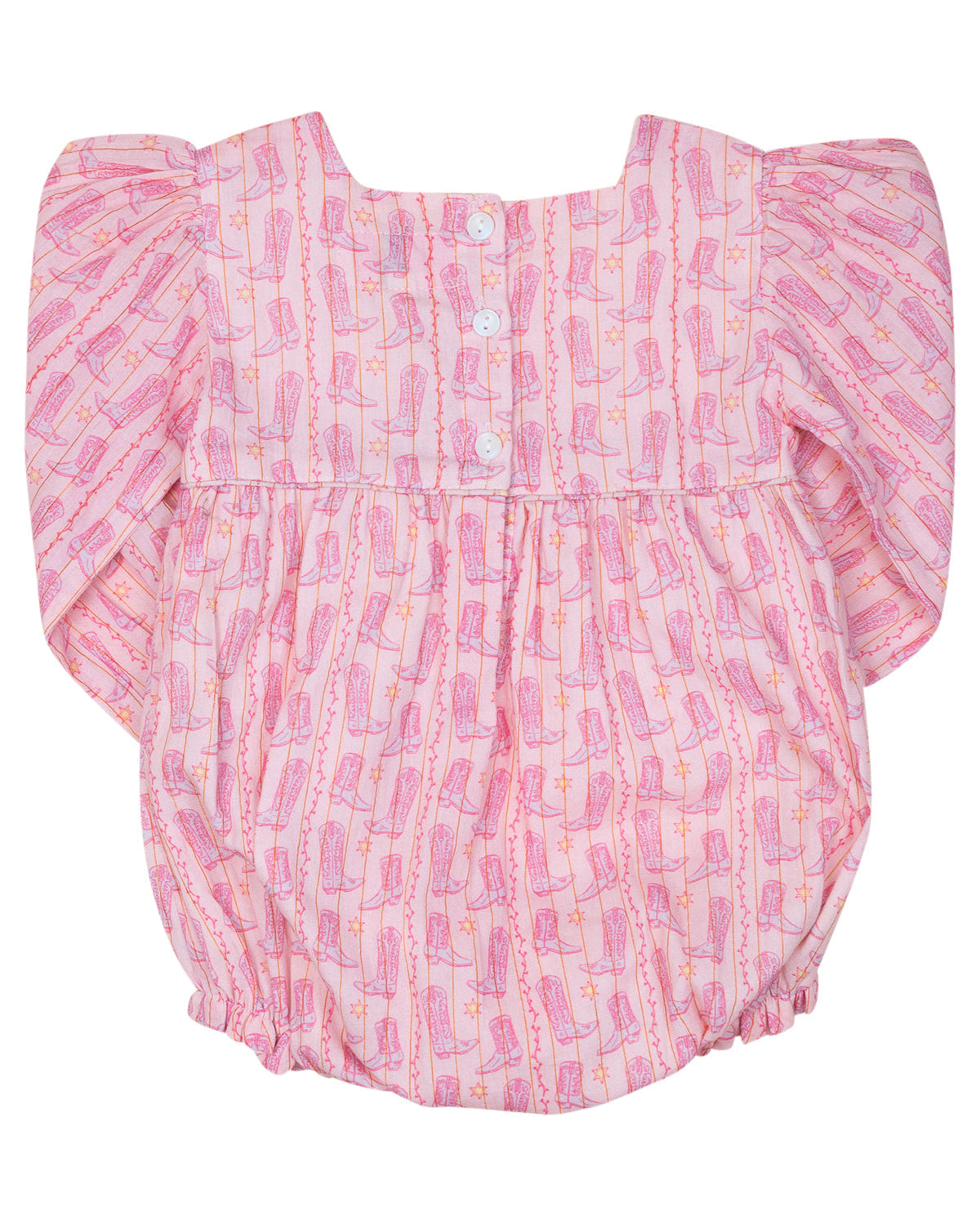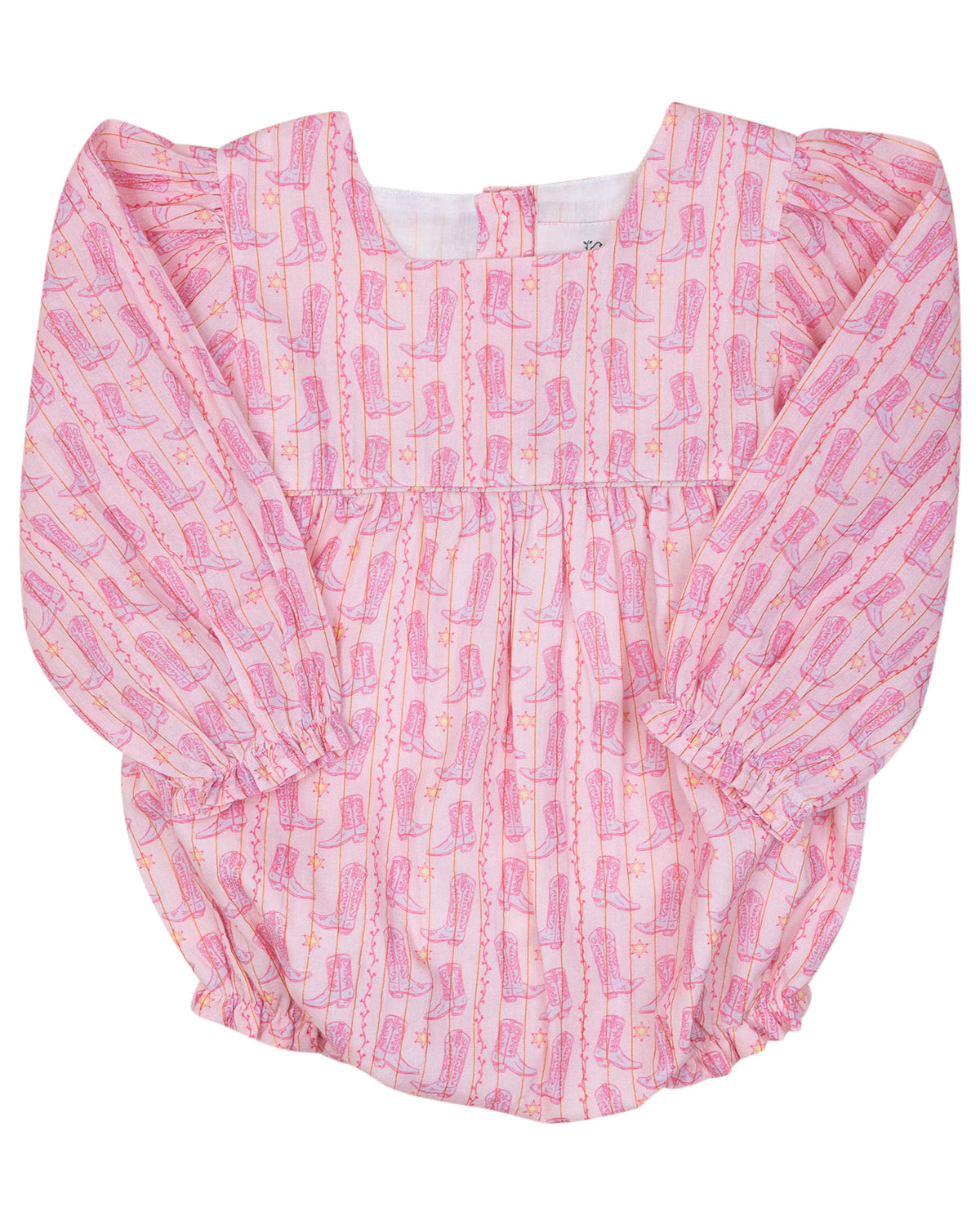See the matching big sister gold lurex dress here! Let your little one shine in this adorable Cowgirl Boots Bubble with Gold Lurex! Designed for comfort and style, this one-piece features a playful western boot print, delicate gold lurex threading, and charming ruffle details at the sleeves and legs. Perfect for rodeo-ready cuteness, holiday photos, or everyday adventures with a touch of sparkle!