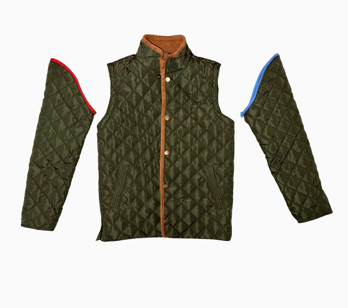 Not sure whether it’s jacket or vest weather? Be prepared for both! Brown Bowen & Co’s Old Village jacket features color coded zip off sleeves to effortlessly go from cold to cool. Quilted and piped in faux suede, and so classic!
