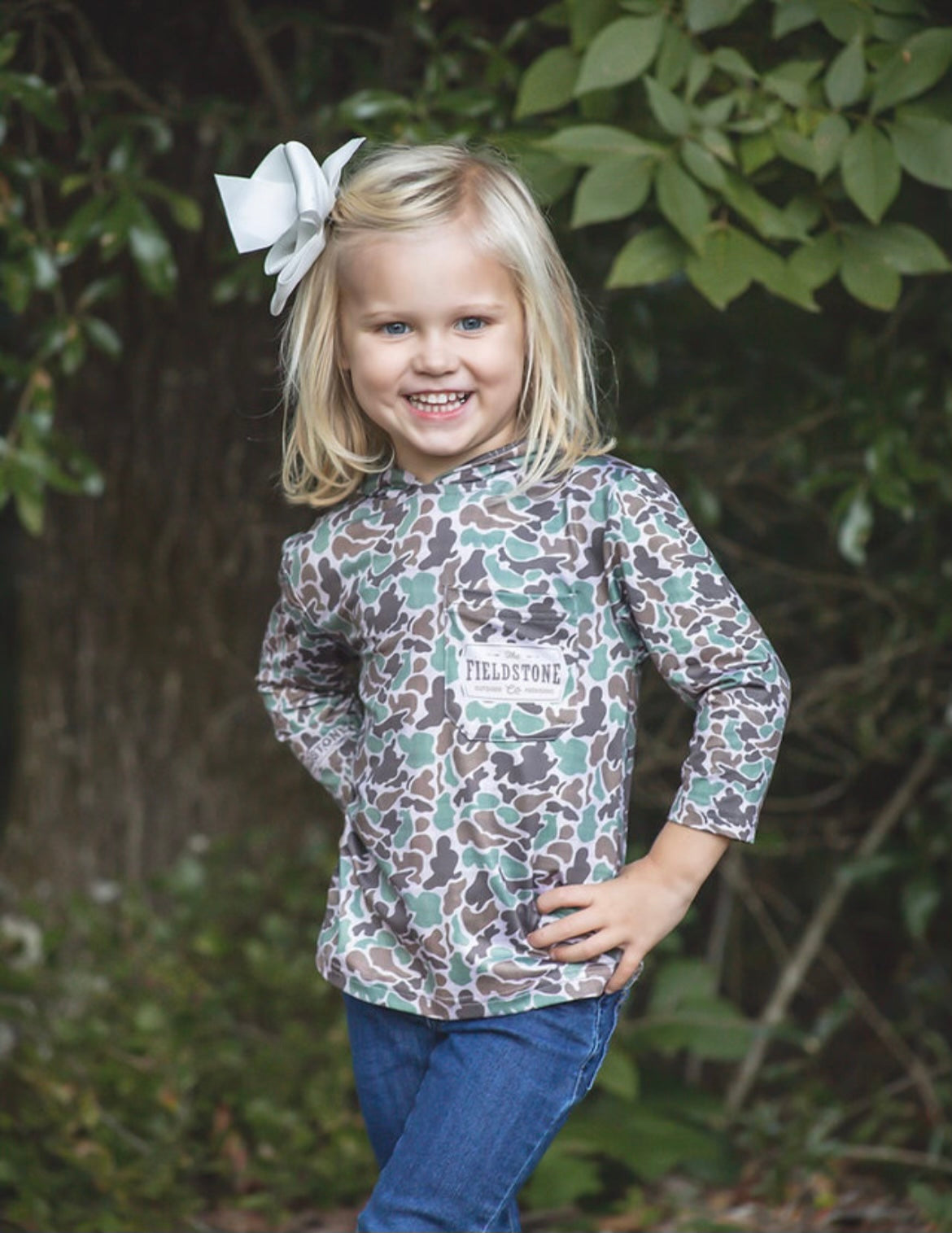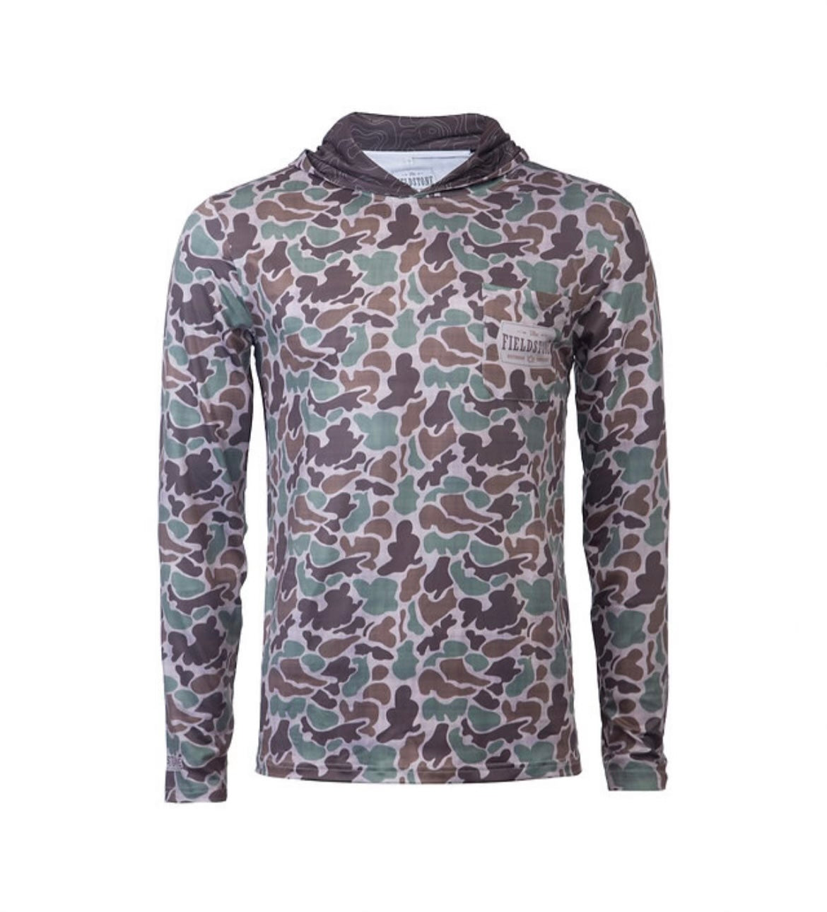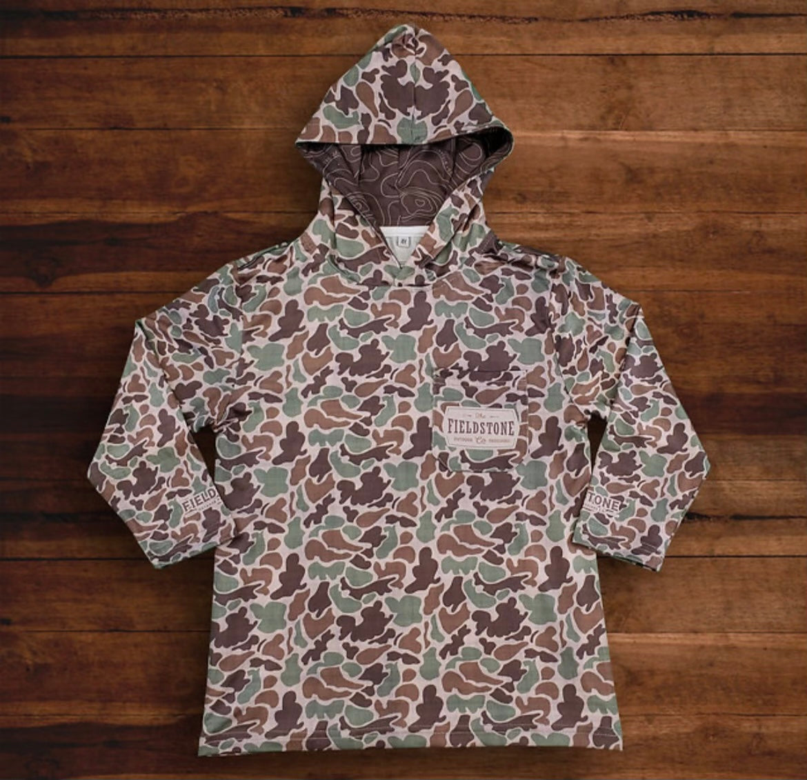Consistently a best seller! Fieldstone Youth Dry-fit Camo Hoodies are made of stretchy, lightweight performance fabric that’s also quick-drying. Back is vented. 97% polyester, 3% spandex.