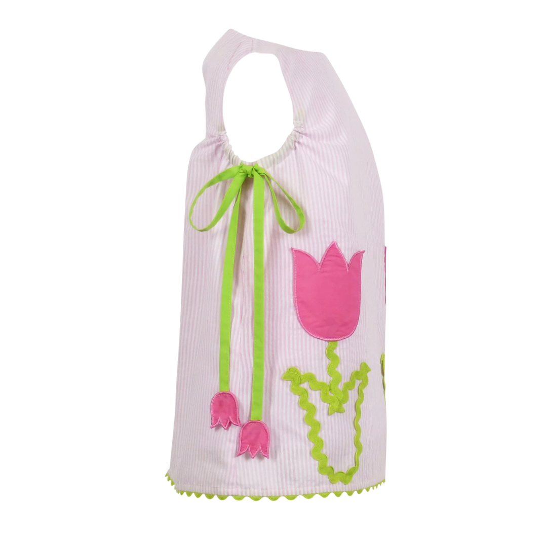 Expertly crafted, the Emma Tulips Jumper features adjustable arm holes and a ric rac hem for a comfortable and stylish fit. The pink seersucker fabric is adorned with delicate tulip embroidery, adding a charming touch to this must-have dress. Perfect for monogramming!