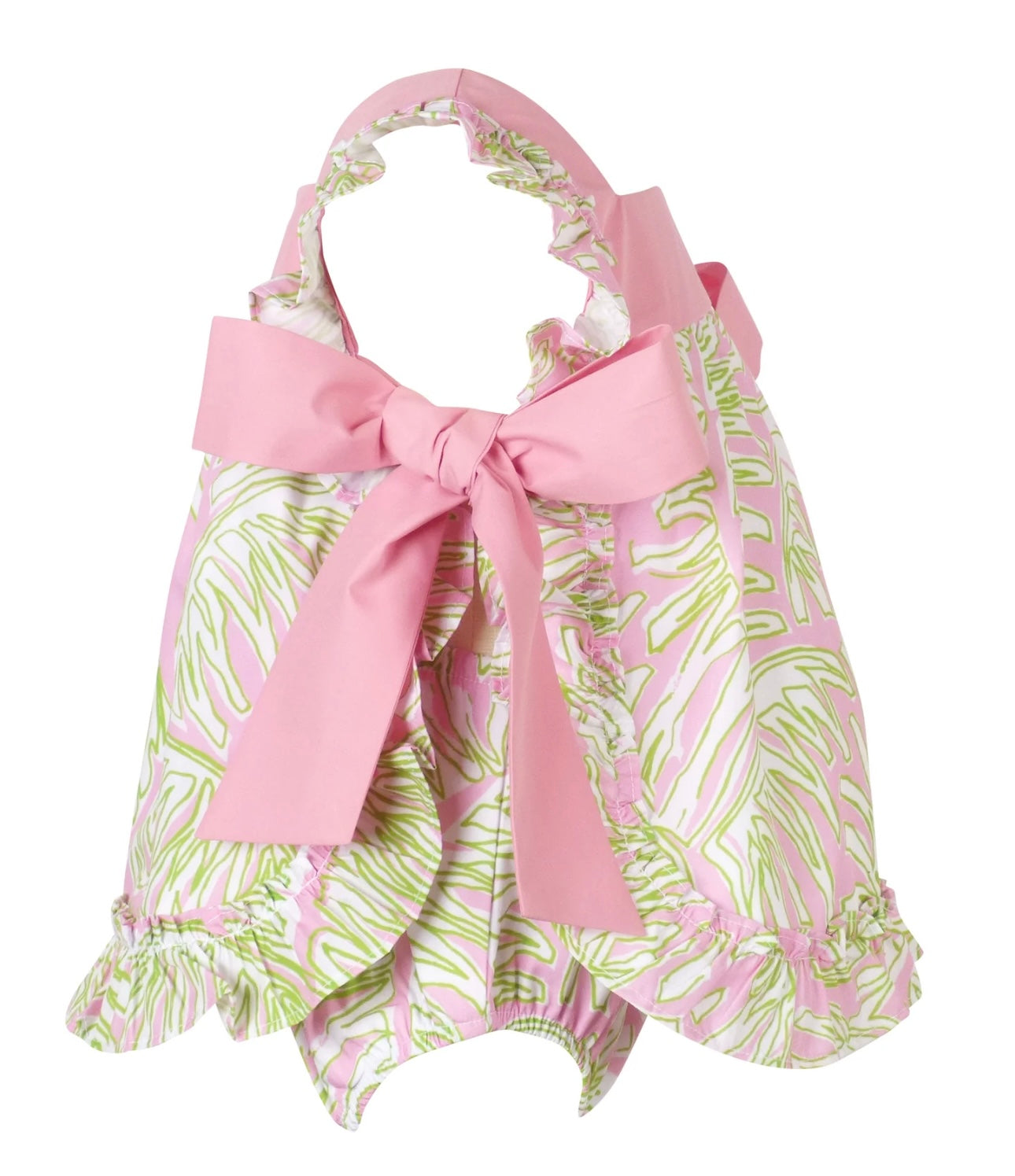 Introduce your baby girl to the sun in style with our Etta Palm Beach Sunsuit. This 2 piece toddler bloomer set features a playful pink and green palm leaf print, a comfortable swing style top, and side bow closures for easy dressing. Keep your little one cool and chic this summer!