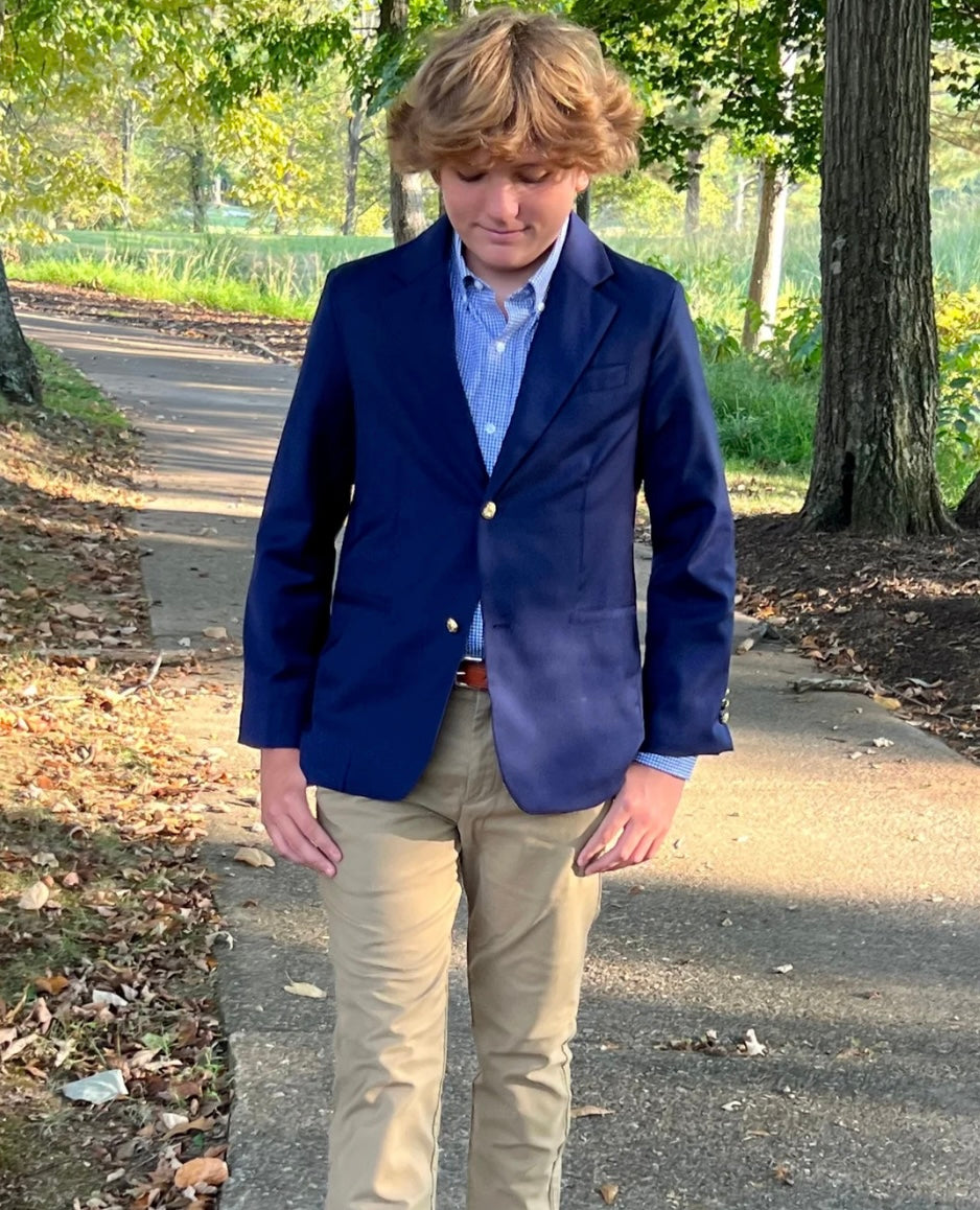 Our classic Bulls Bay Blue Gentleman's Jacket has quickly become a favorite for boys of all ages! This one is constructed with a lightweight wool that's perfect for all year wear! Wool is naturally temperature regulating, odor resistant and moisture wicking, but to make it even better, we lined this with our signature blue gingham performance fabric. It's timeless and can easily be dressed up or down for any occasion. Pairs well with everything, including our Kiawah Khaki Palmetto Pants! Two button closure, front welt pockets. The crested gold buttons add the perfect finishing touch!