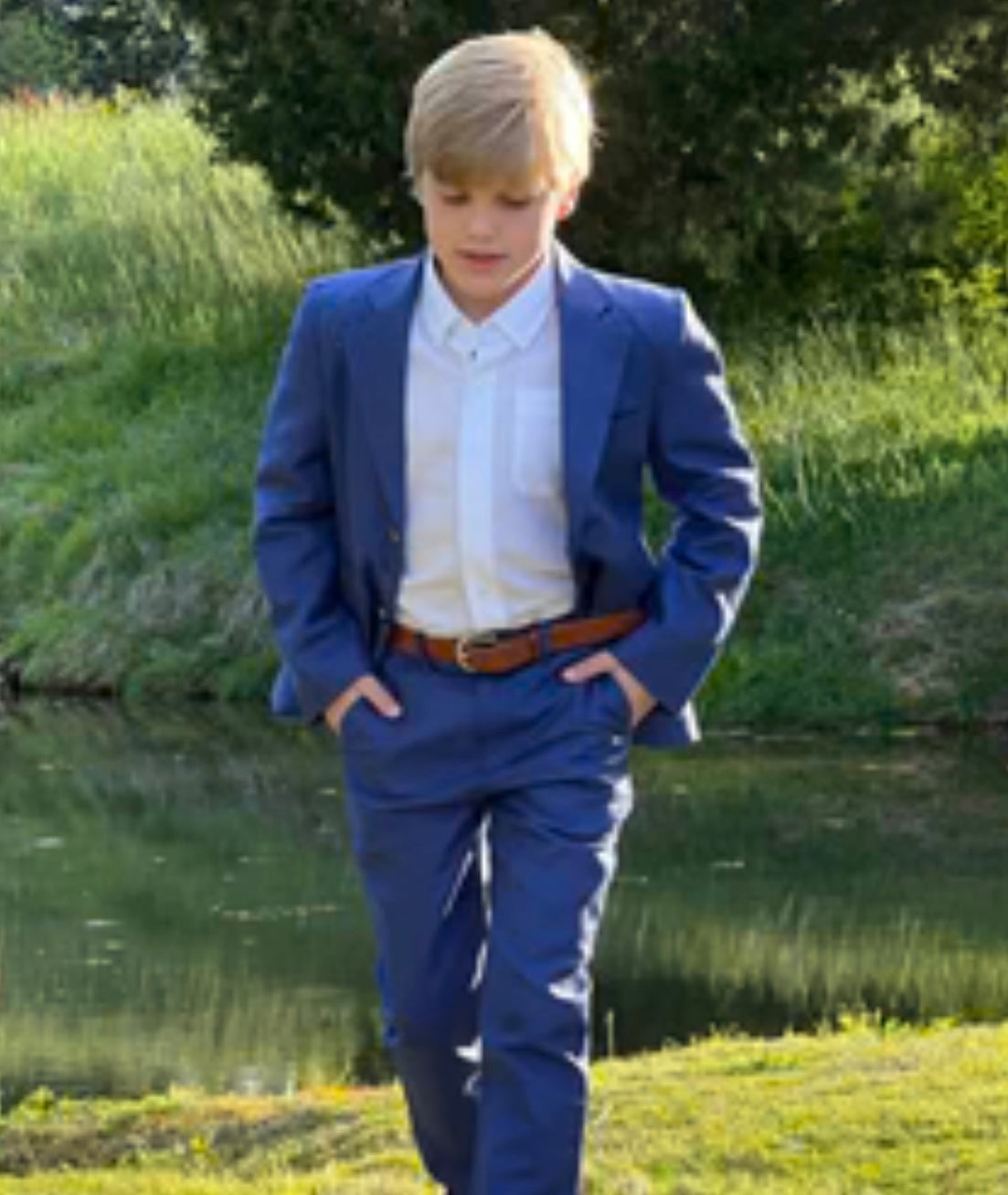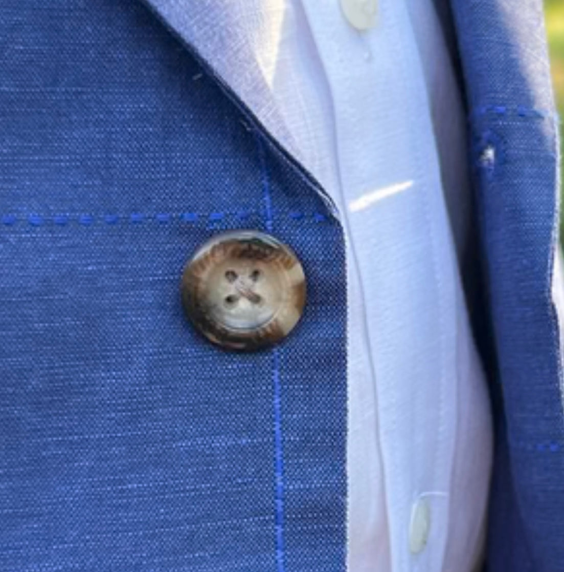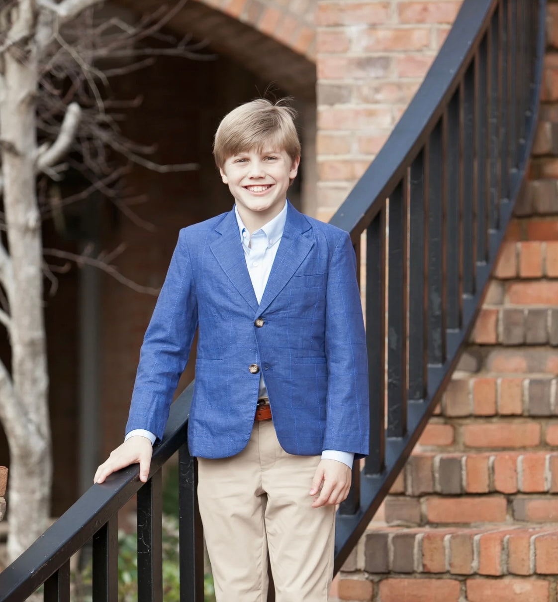 Your gentleman will look extra dapper in Brown Bowen Co.'s Folly Beach Blue Linen Gentleman's Jacket. This classic light navy linen jacket has a cobalt blue stitched windowpane pattern that is absolutely stunning. It's constructed of linen/cotton blend. The jacket is fully lined and features tortoise shell buttons. Made with American cotton.