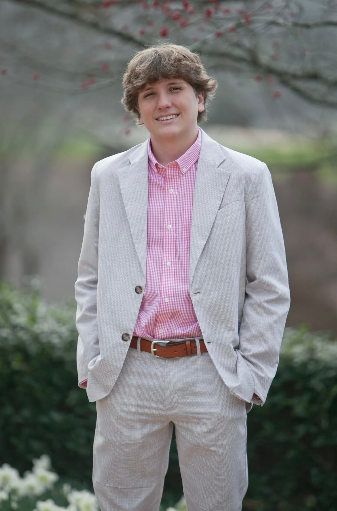 Your gentleman will look extra dapper in our Kiawah Khaki Houndstooth Gentleman's Jacket. This classic khaki houndstooth linen jacket is absolutely stunning. It's made of a linen/cotton blend. The jacket is fully lined and features tortoise shell buttons. Made with American cotton.