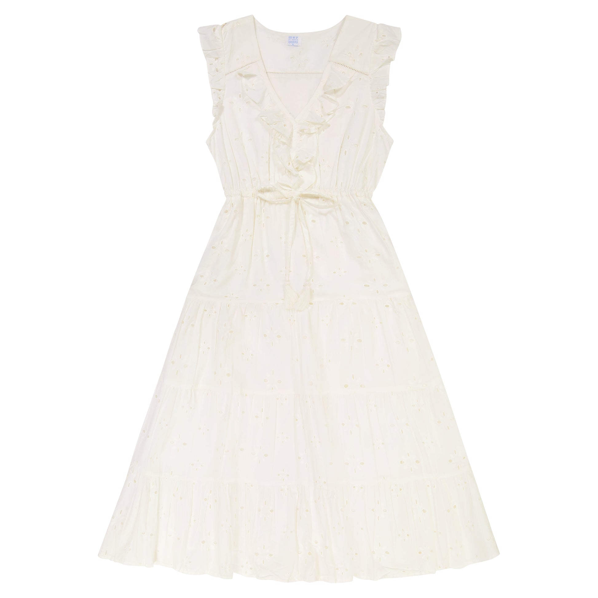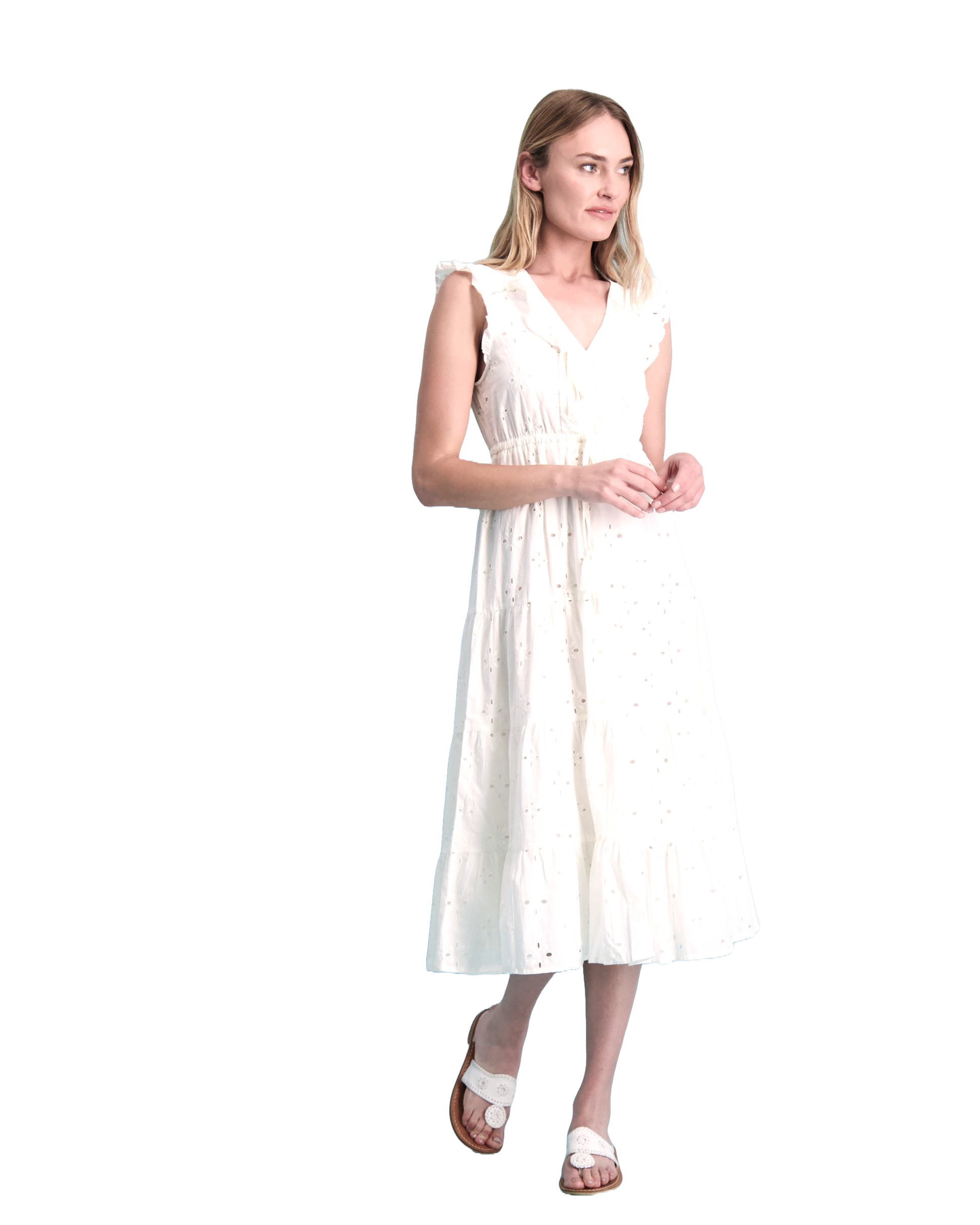 Flirty ruffles and flutter sleeves make the Giselle maxi dress the season's answer to effortless style now in a dreamy, creamy white eyelet. Dress features a deep V neck and drawstring waist with tassel detailing.