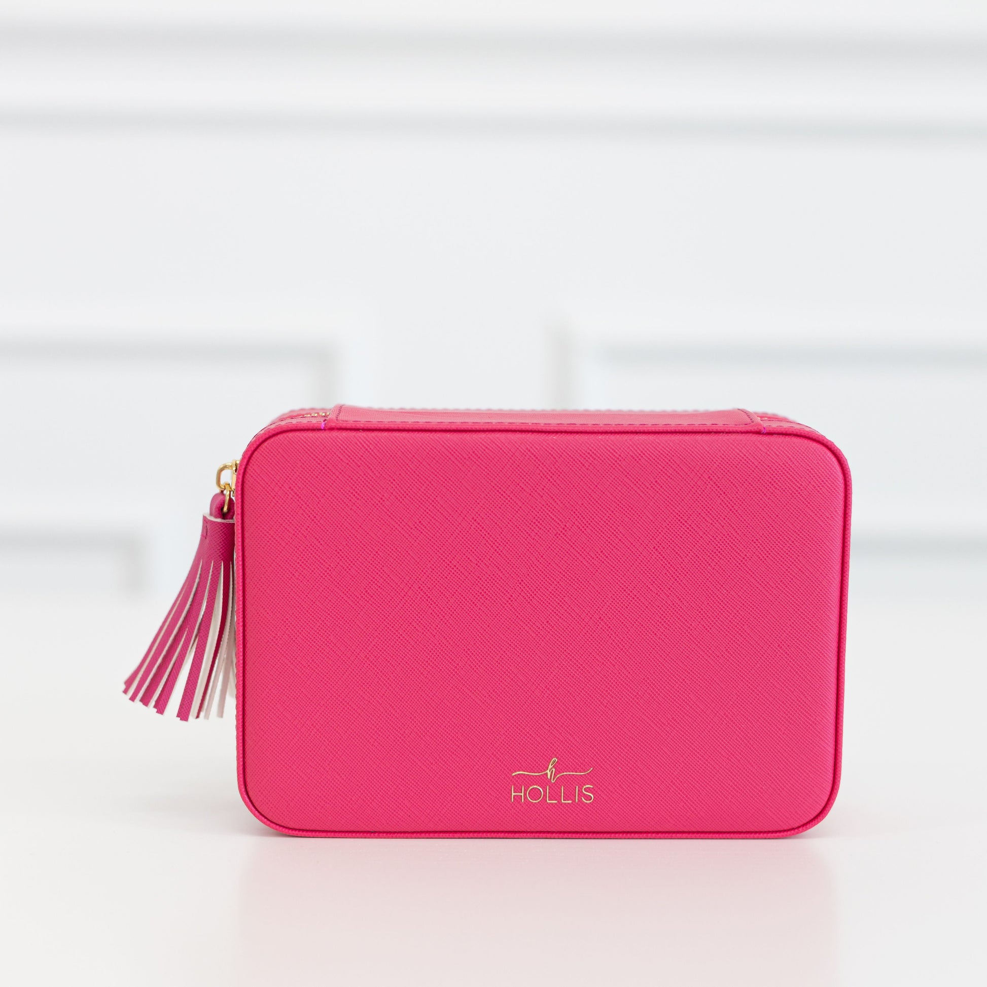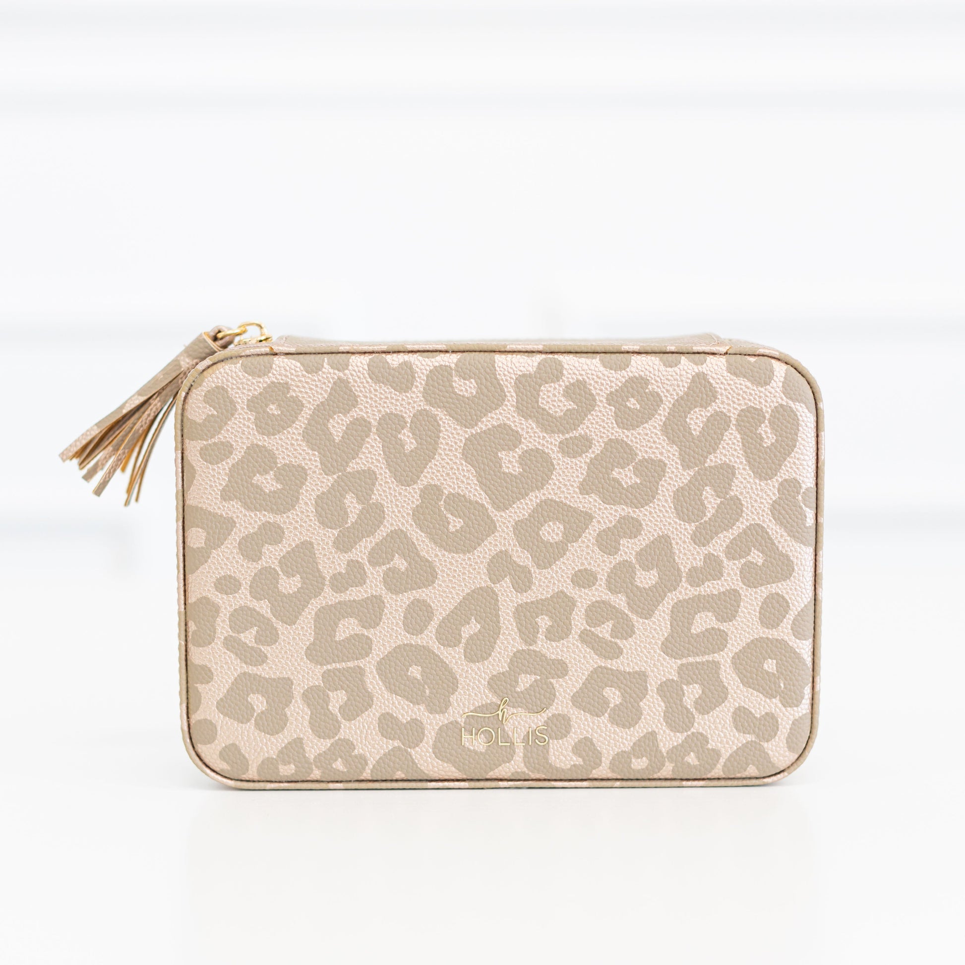 Travel with ease and keep your jewelry organized with our timeless jewelry organizer. Designed to store necklaces, bracelets, earrings, and rings in a display-worthy fashion, this organizer ensures your precious accessories remain tangle-free and protected. Available in our six iconic colors - Leopard, Blush, Nude, Metallic Mocha, Hot Pink, and Pixie Pink - you can select the one that suits your style best. Measuring at 8"x5.5"x2.5", this compact and versatile organizer is the perfect travel companion. Choose functionality and elegance with our jewelry organizer and embark on your next journey worry-free.