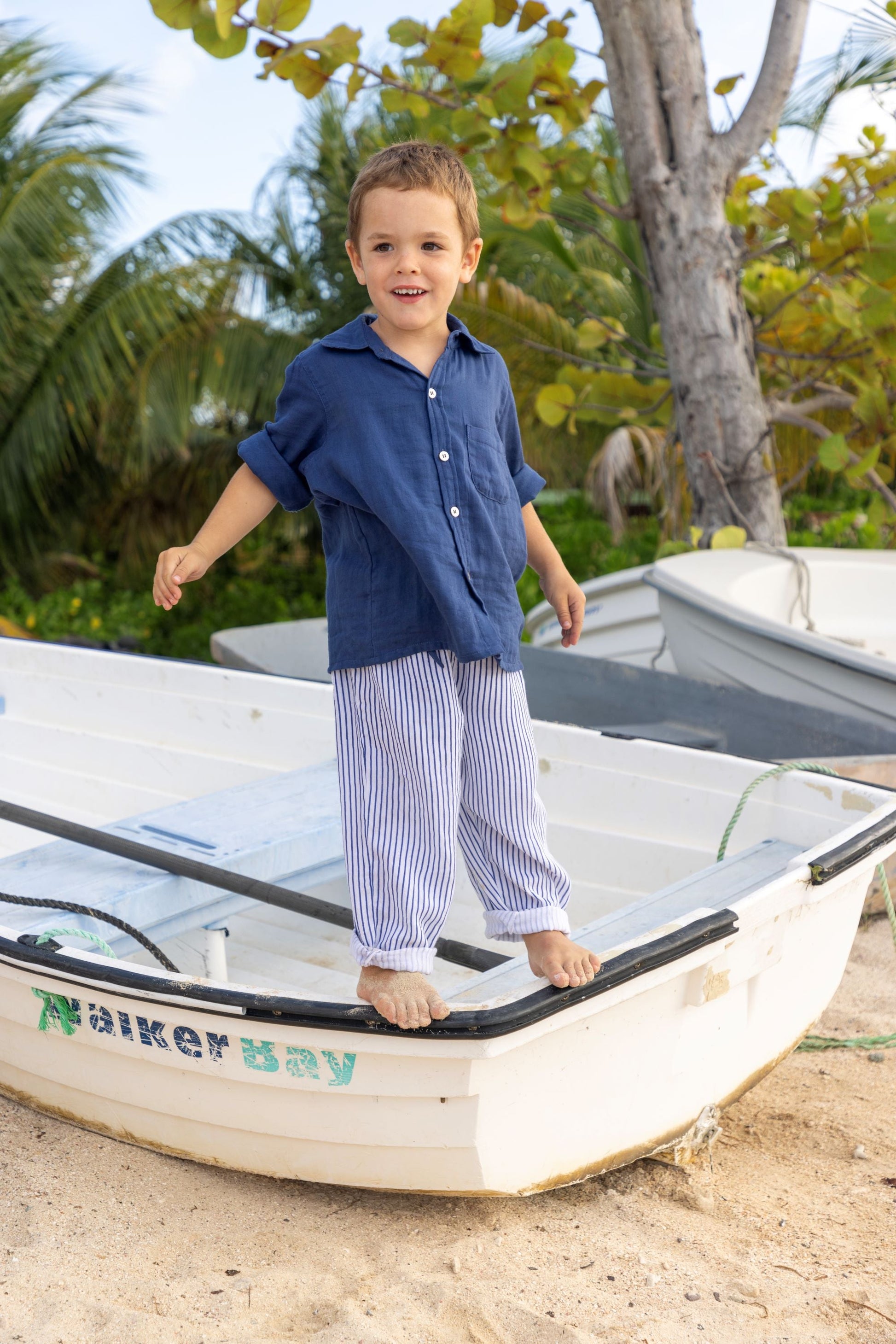 Get ready to make a splash with La Plage Boy's Drawstring Pant Marine Stripe! These relaxed beach pants in soft cotton gauze are perfect for fun in the sun. Roll up the legs and dive into the water with ease. No fuss, just fun! 100% cotton gauze.