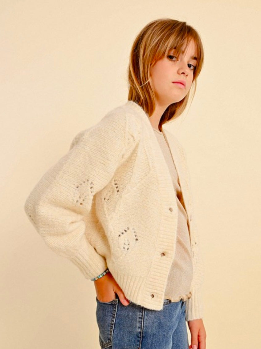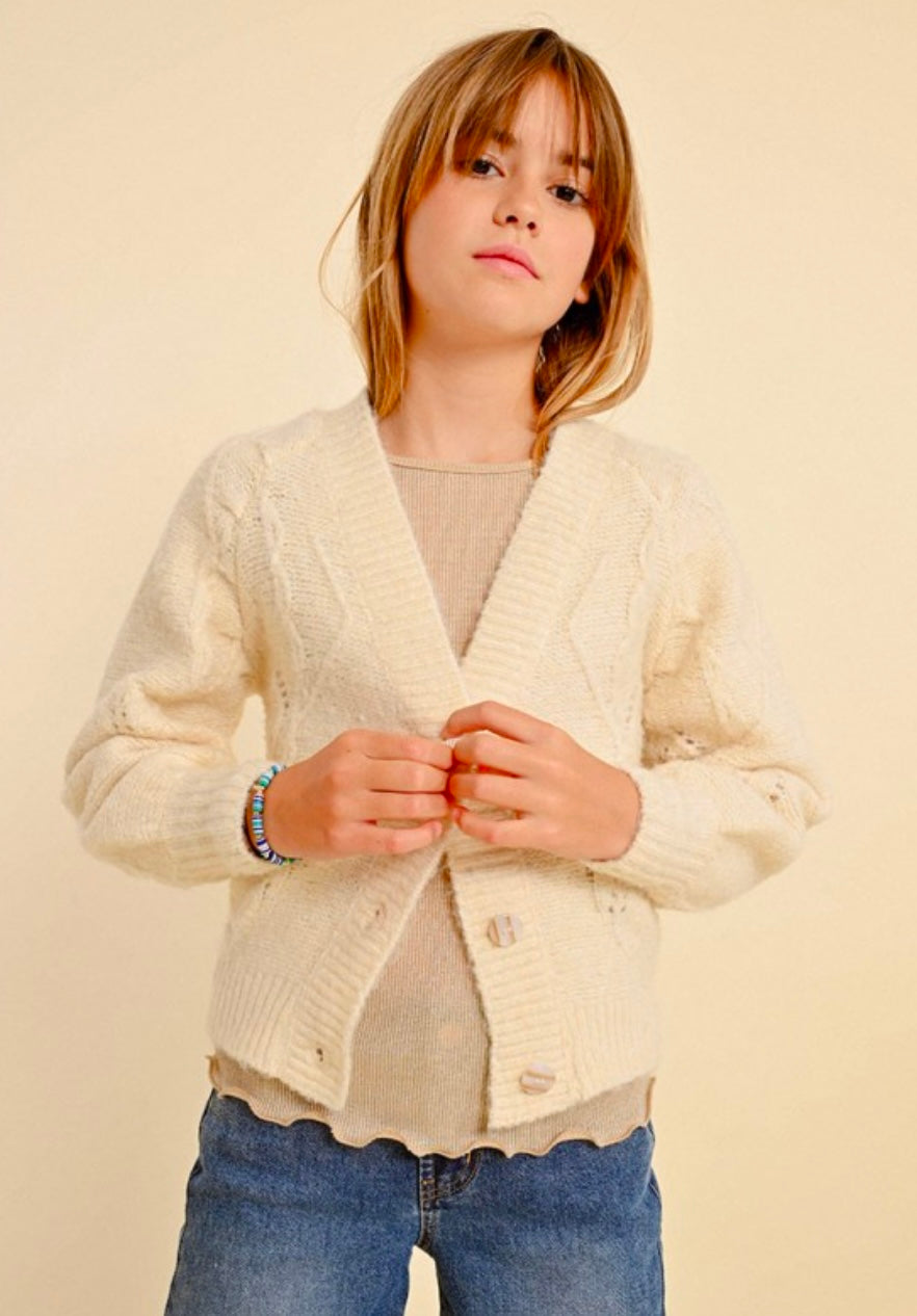 This Off White Pointelle Knit Cardigan is designed with a v neck and a stylish outfit addition for any tween girl. Made from chunky pointelle knit, it provides a cozy and comfortable fit. Perfect for layering on cool days!
