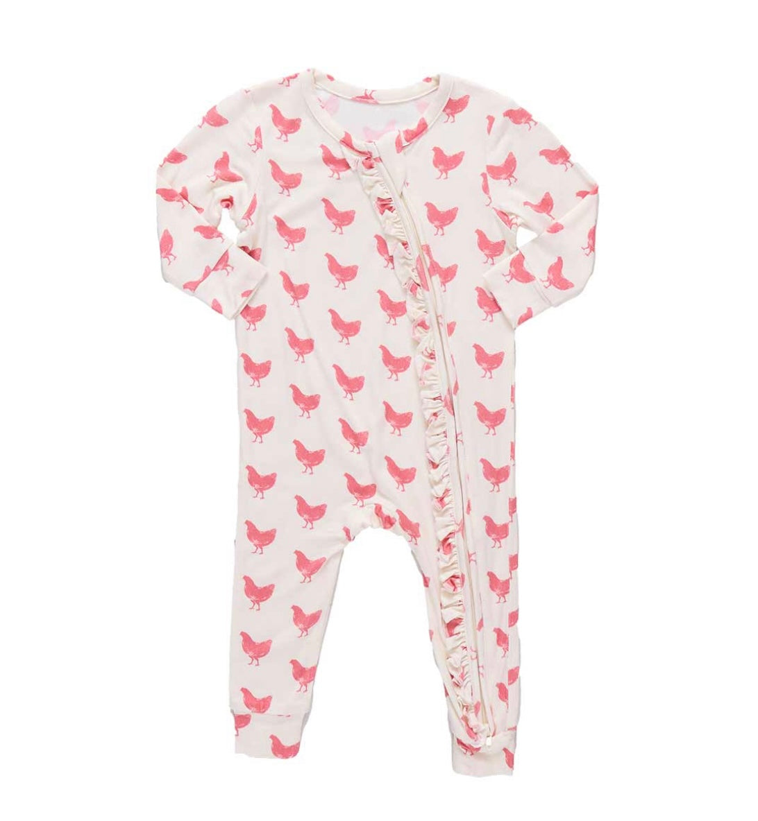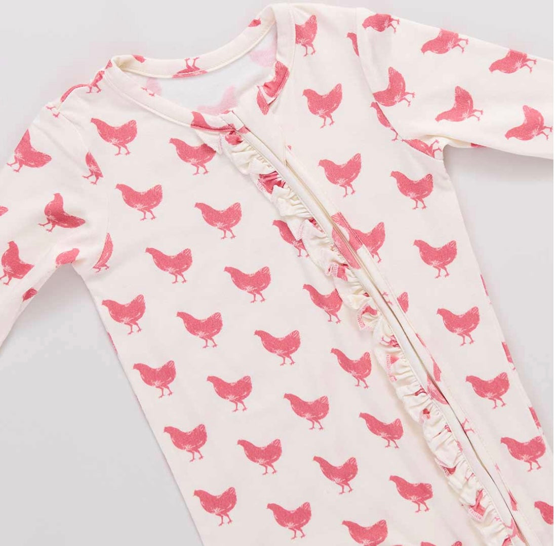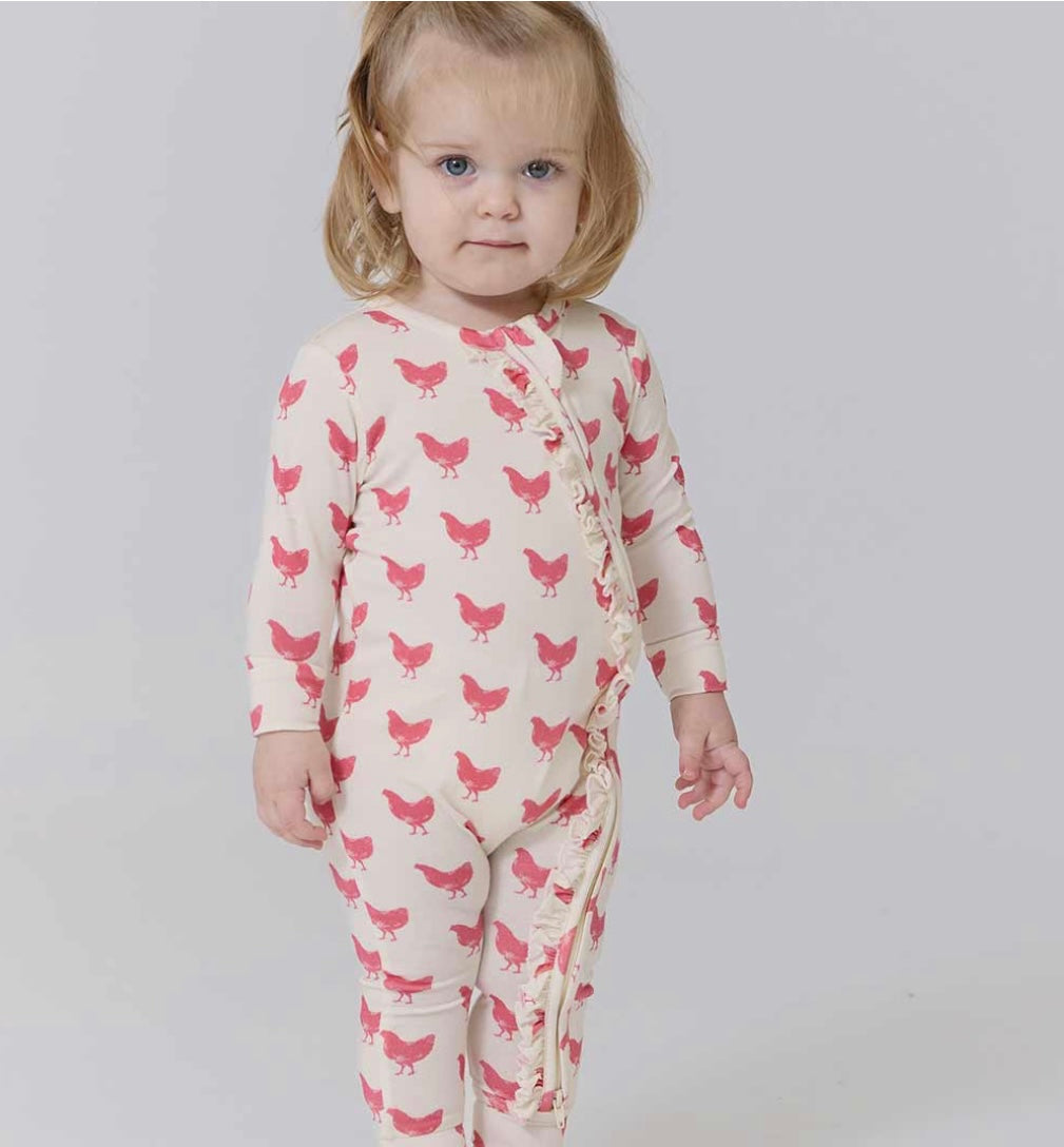 Ruffle and Ready! Our super cozy Baby Girls Bamboo Ruffle Romper features fold-over hand and foot cuffs on sizes 0/3m and 3/6m, a zipper cover to protect baby and a ruffle accented two directional zipper for easy diaper changes. Crafted in bamboo fabric, this long sleeve romper is crazy soft with a smooth, silk-like texture. Bamboo is breathable and keeps littles cool & comfortable in the summer. Available in Ballet Slippers, Pink Small Hearts, Pink Chickens and Dandelion block print.
