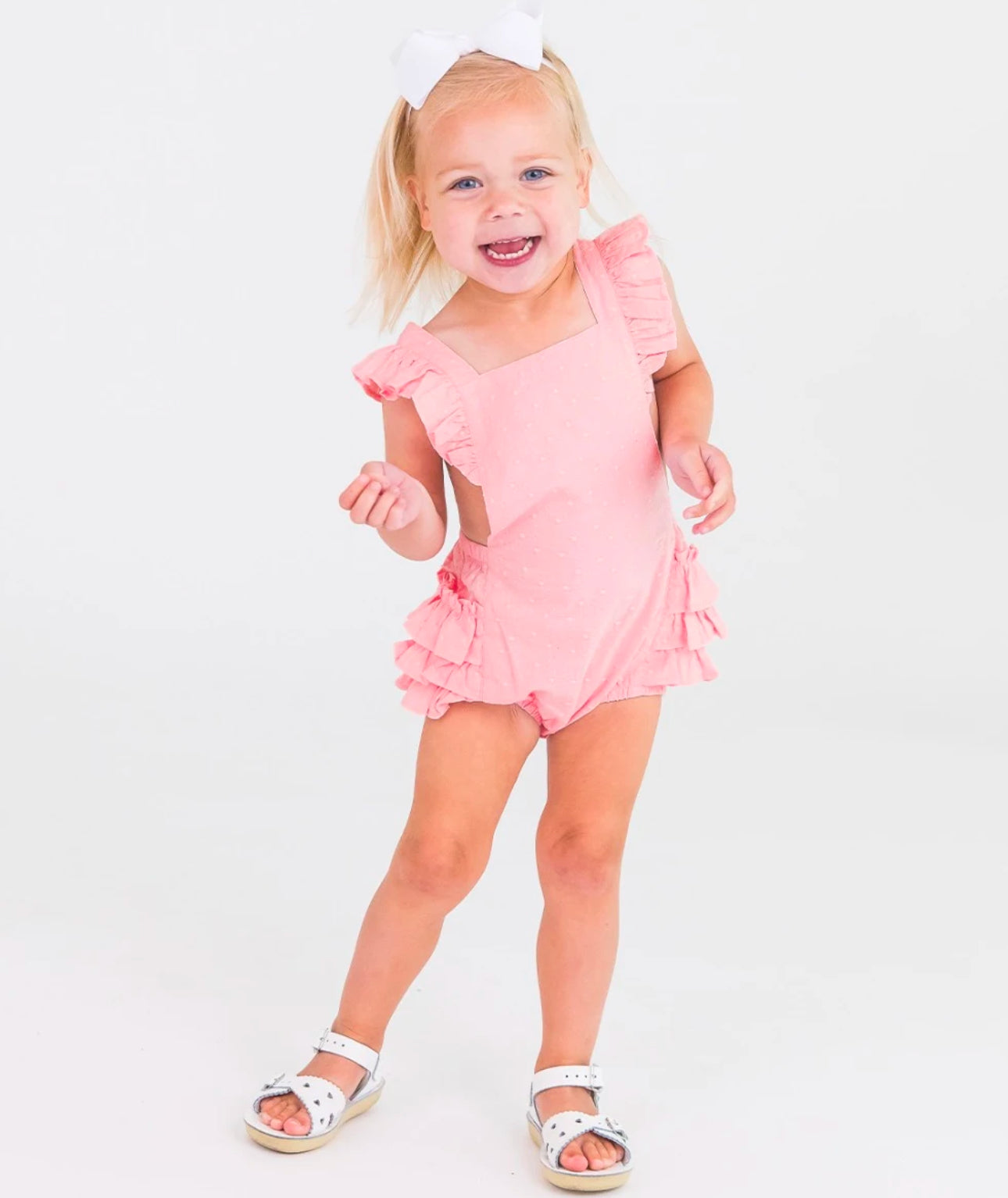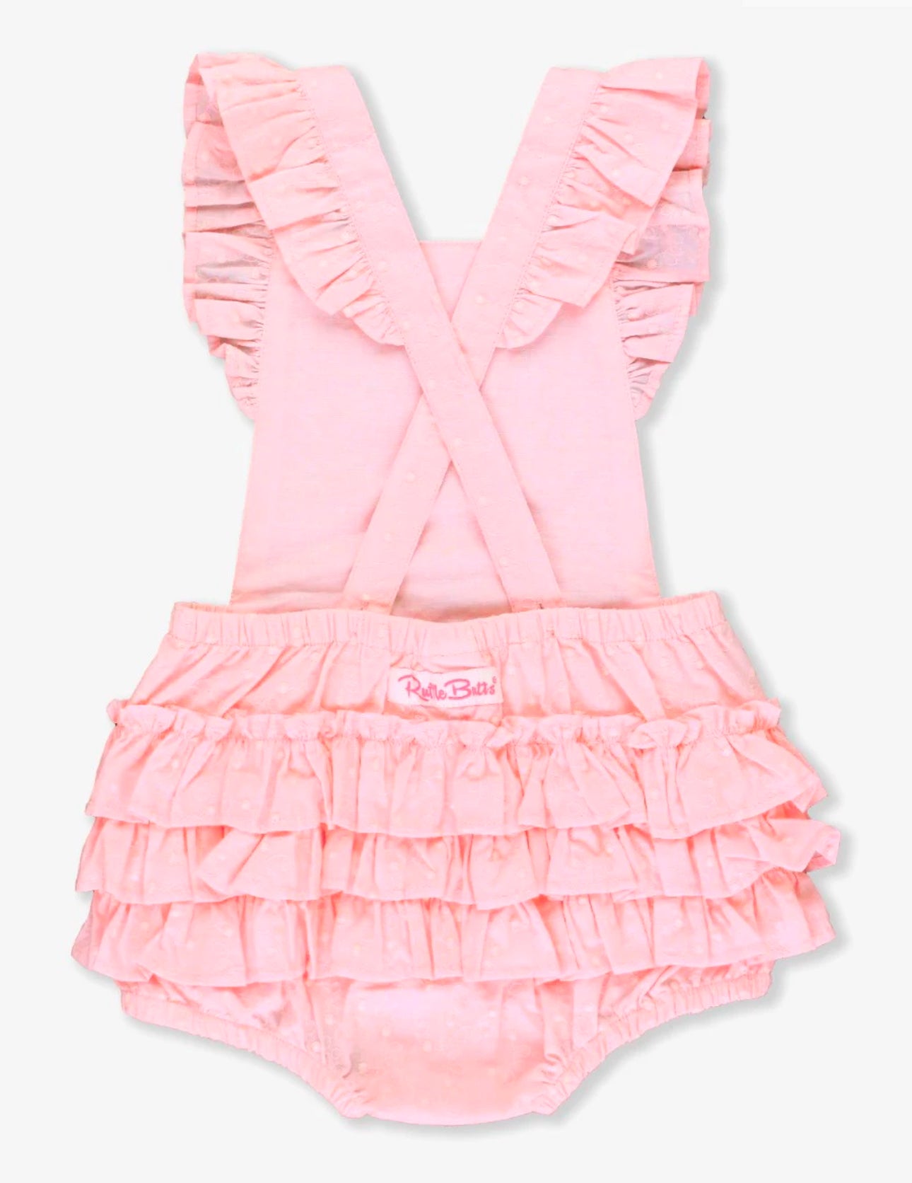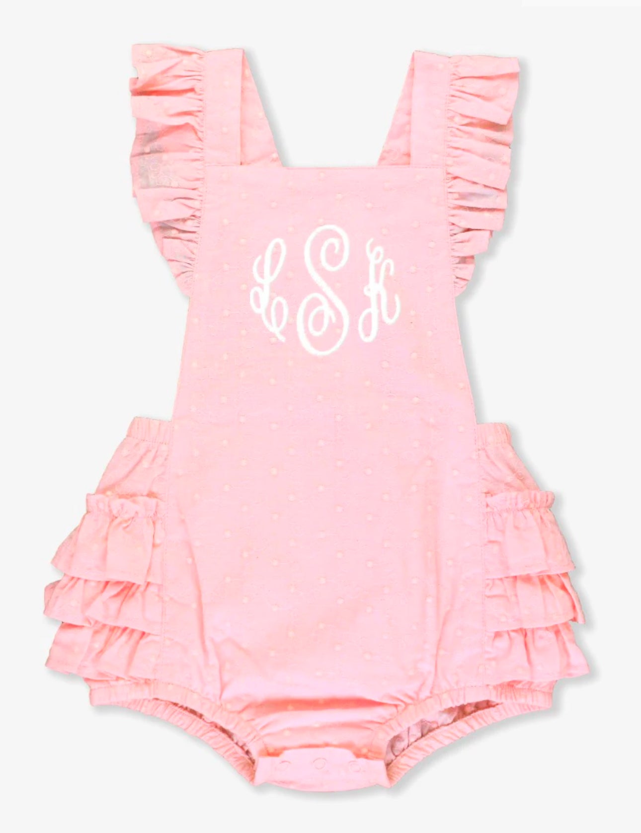 Enhance your baby girl's warm-weather wardrobe with our Pink Embroidered Vintage Dot Flutter Romper. This sunsuit features delicate ruffle details and cute bottom ruffles. Perfect for sunny days and stylish playdates. Don't forget to add. your monogram!