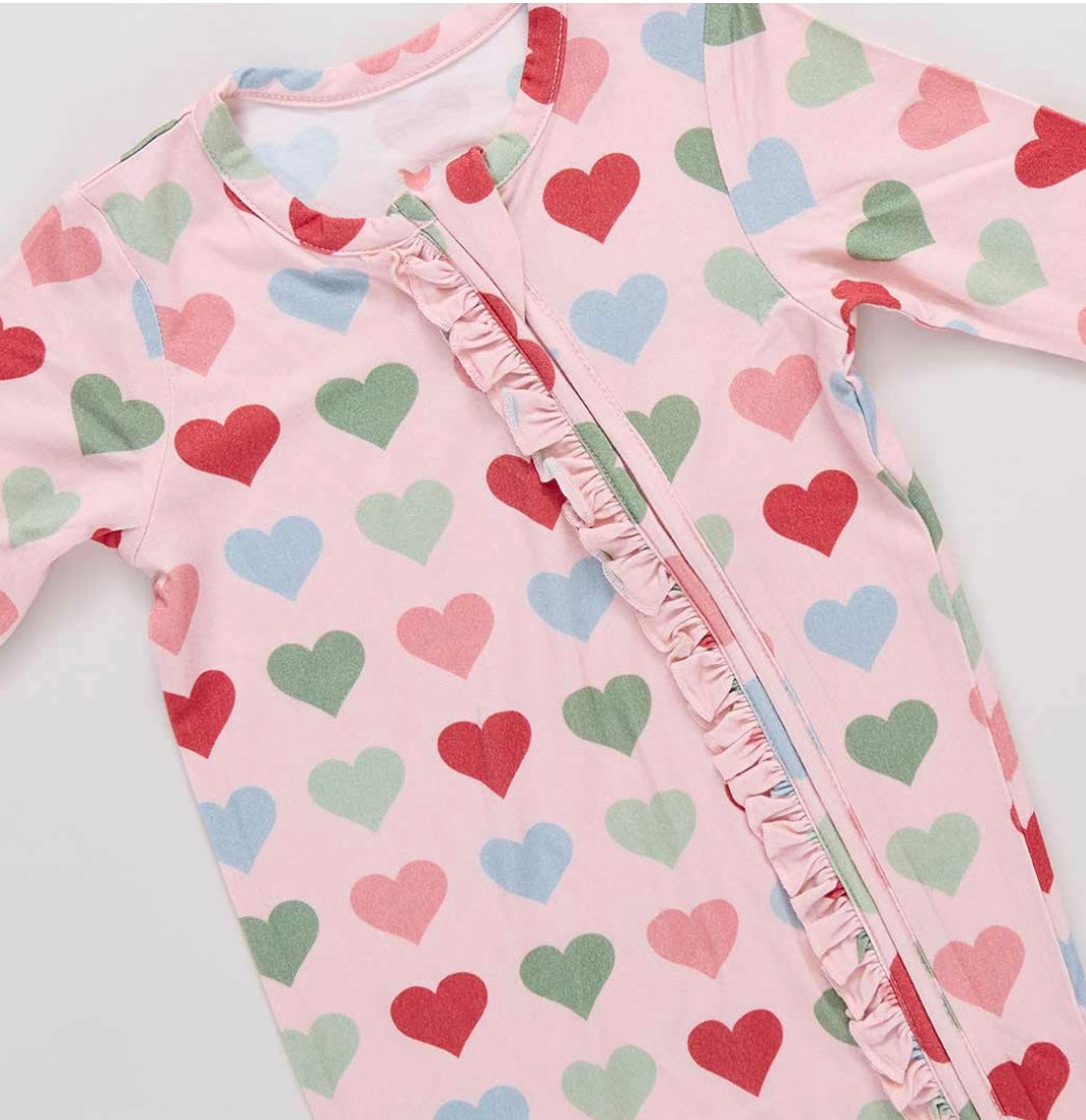 Ruffle and Ready! Our super cozy Baby Girls Bamboo Ruffle Romper features fold-over hand and foot cuffs on sizes 0/3m and 3/6m, a zipper cover to protect baby and a ruffle accented two directional zipper for easy diaper changes. Crafted in bamboo fabric, this long sleeve romper is crazy soft with a smooth, silk-like texture. Bamboo is breathable and keeps littles cool & comfortable in the summer. Available in Ballet Slippers, Pink Small Hearts, Pink Chickens and Dandelion block print.