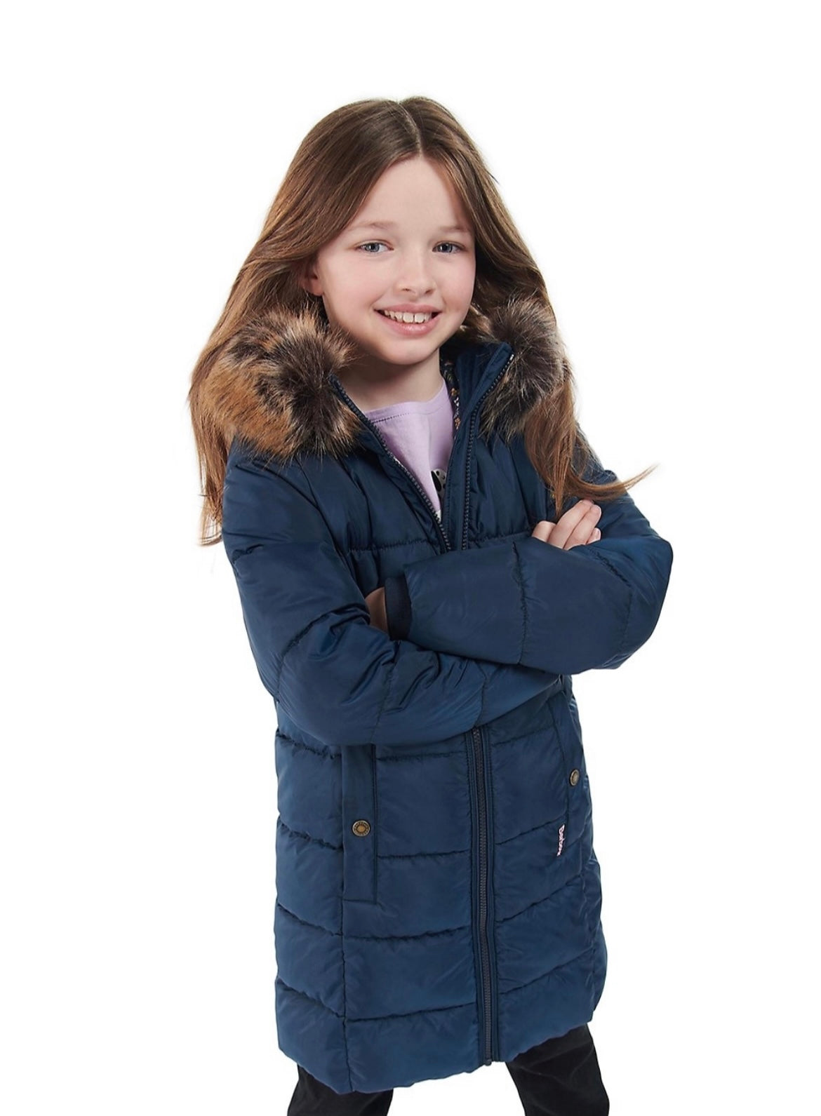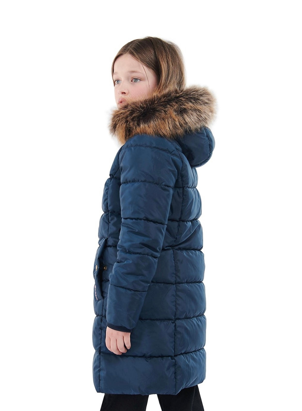 The long length of this Barbour Girls Rosoman Quilt Jacket makes it the perfect cold weather accessory to make your child look extra chic and warm. Hood is lined in faux fur. Made for the coldest weather!