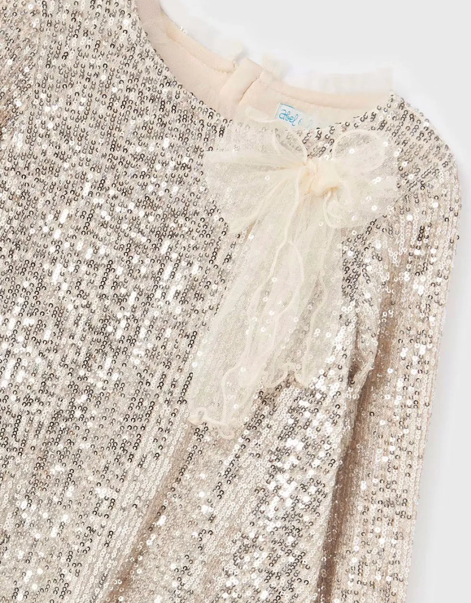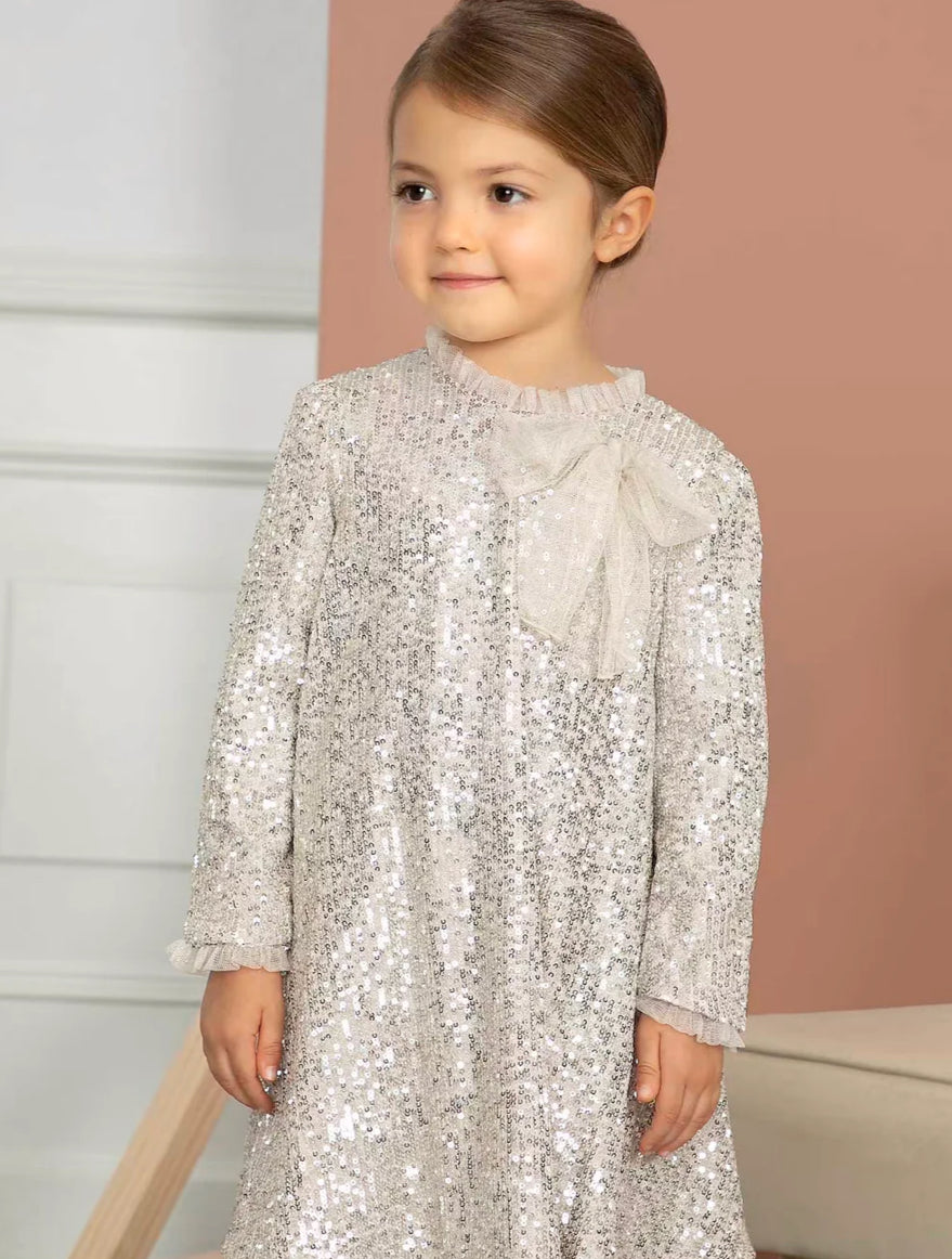 Did someone say they needed a holiday party dress? Sequins, sequins & more sequins, this silver sand, champagne color dress is the answer to all your tweens Holiday, Christmas and New Years Party needs.