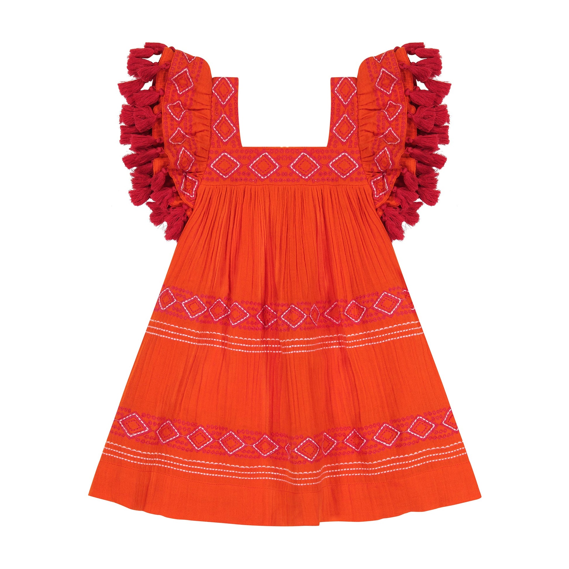 Part of our Mommy & Me Collection! This Serena Girl's Tassel Dress is crafted from soft cotton gauze and features whimsical embroidery, a double flutter sleeve, a twirly skirt, and tassel and pom pom detailing. Perfect for any special occasion, this dress is sure to make your little one feel like the princess she is.