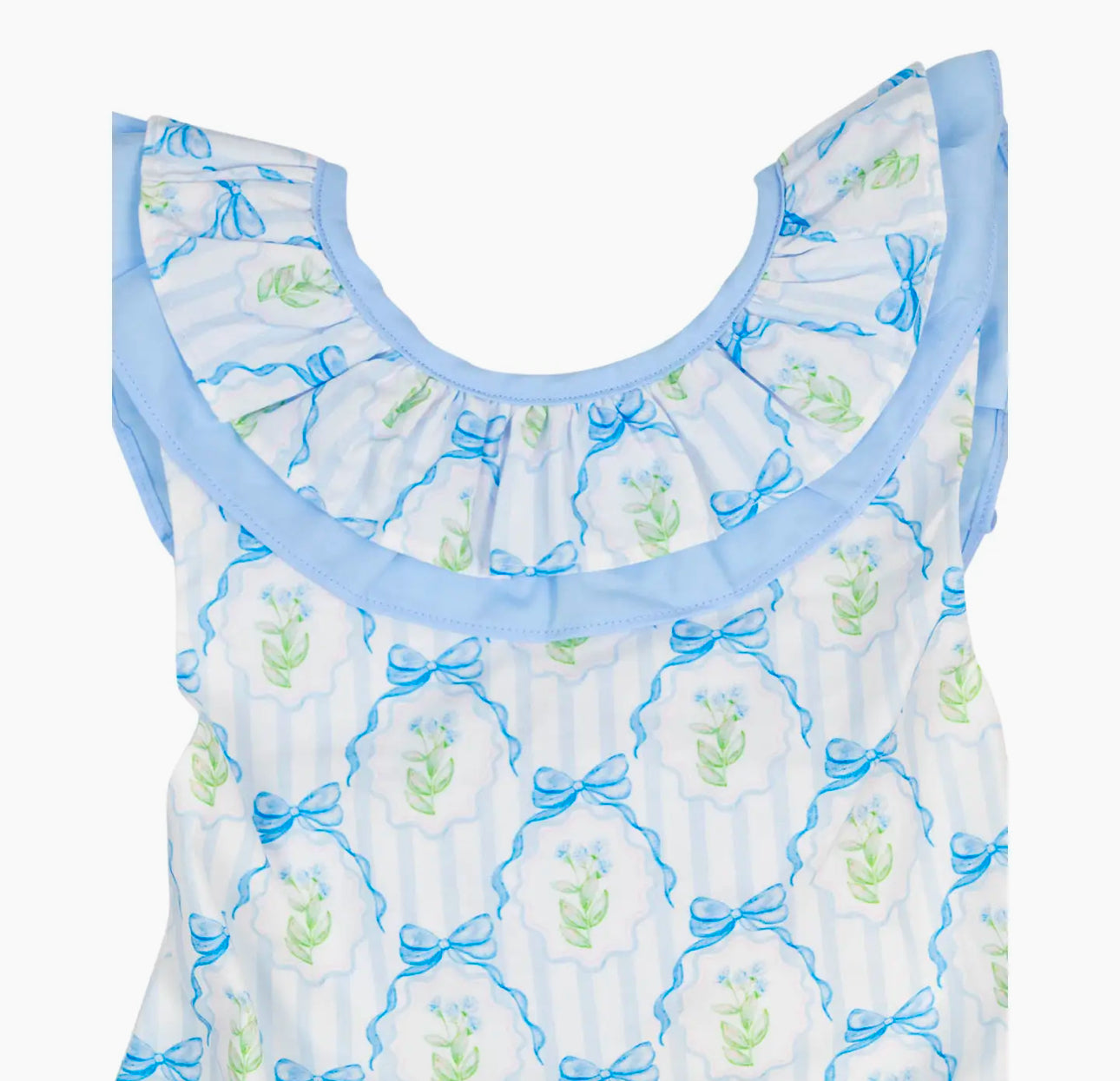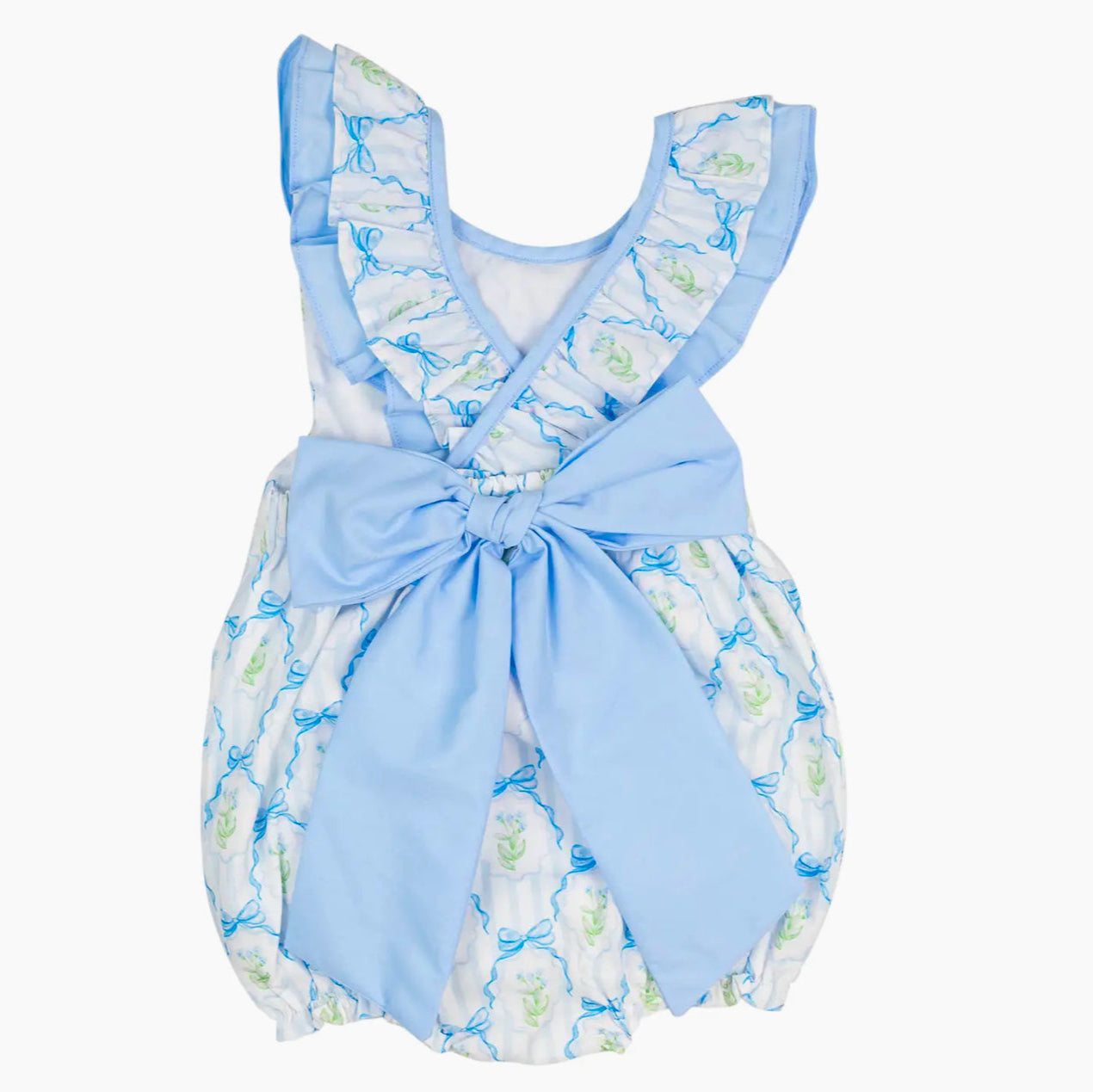 Designed to perfectly coordinate with the bigger girls Josie Dress, the Blue Floral Josie Bubble features a lovely ruffle collar and tie back for a charming touch. With its delicate floral pattern and expertly crafted design, this bubble is the perfect addition to any little girl's wardrobe.