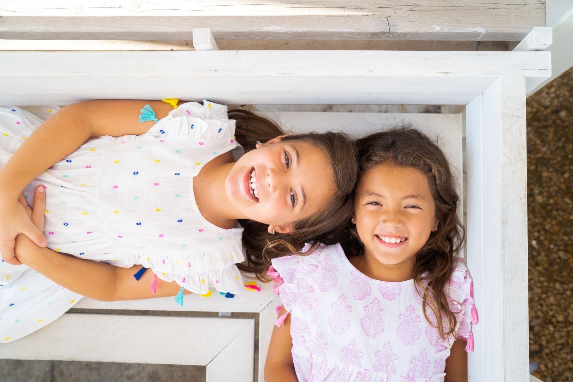 Beloved Sophie tassel dress feautures scoop neckline, row of tassels and tiered twirly skirt. 100% cotton voile.