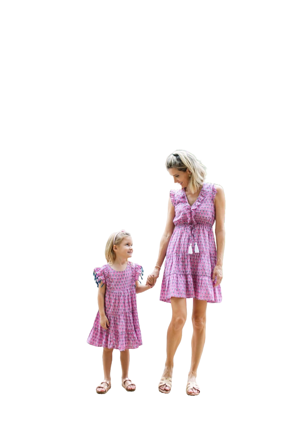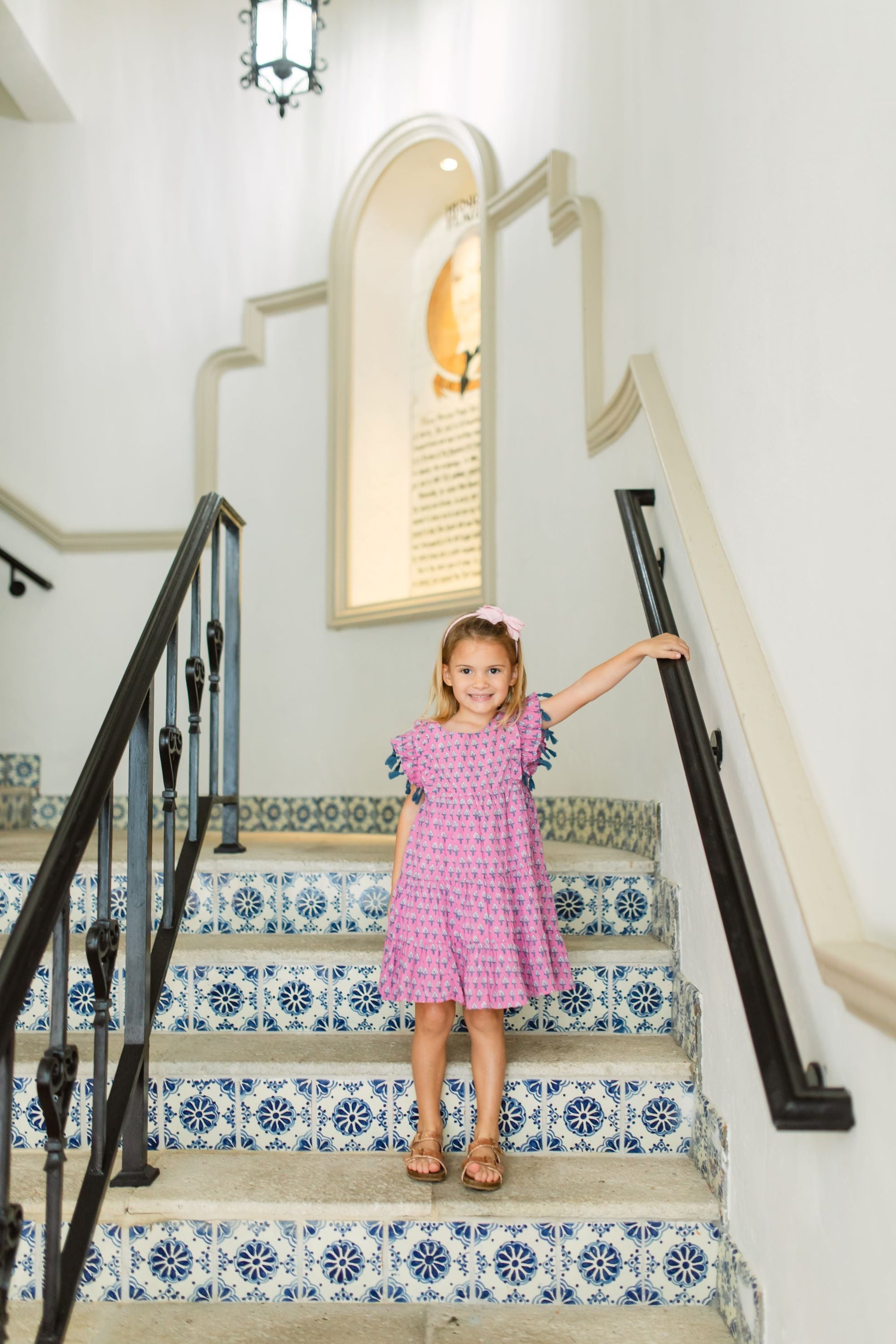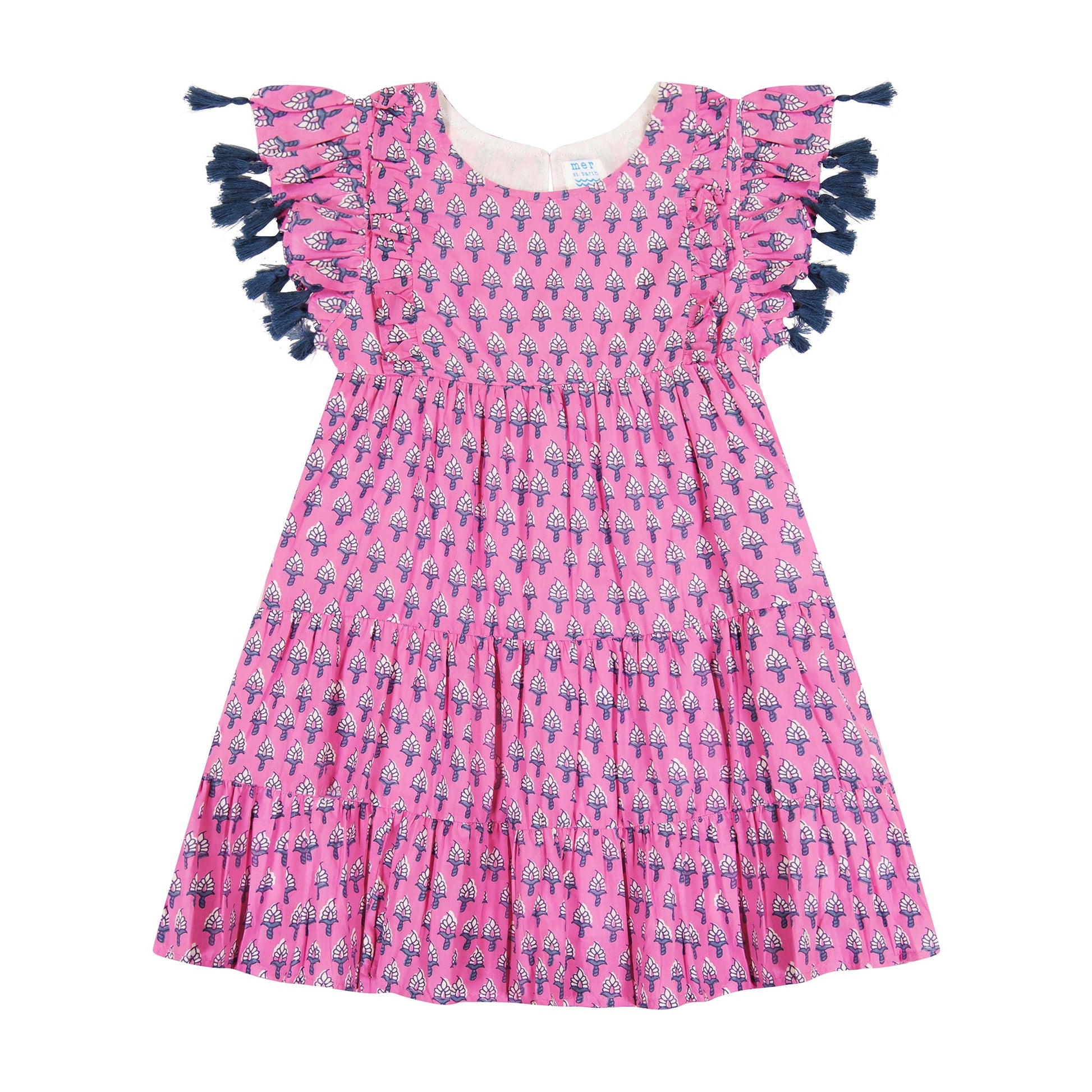 Beloved Sophie tassel dress features a scoop neckline, row of tassels at sleeves and tiered twirly skirt.