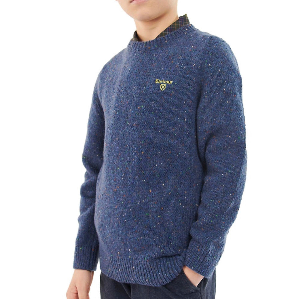 Gorgeous boys navy sweater by Barbour made of tweed fleck yarn. This wool blend pullover sweater has a crewneck, and ribbed trim. 60% wool, 20% viscose, 20% polyamide.